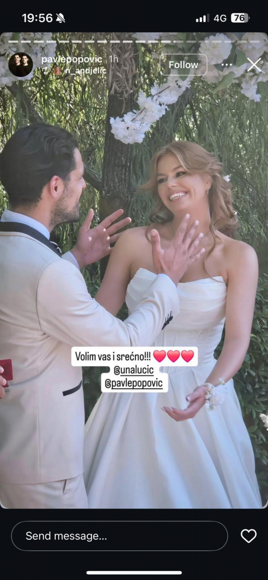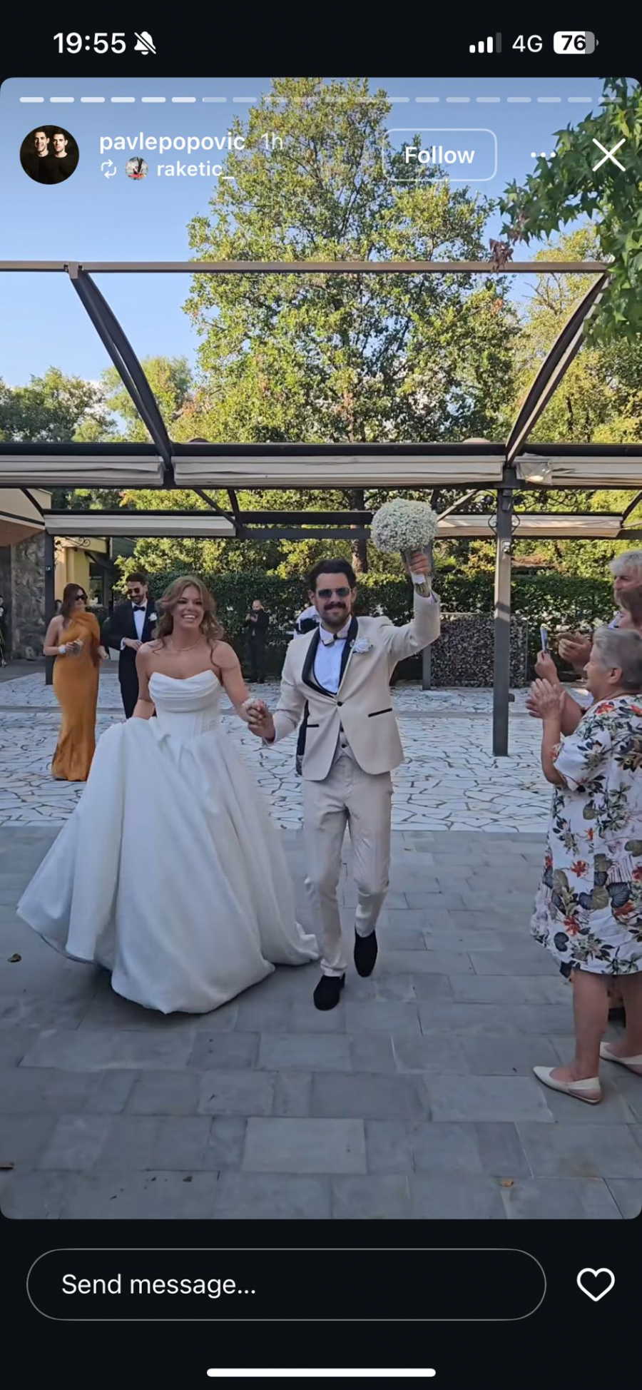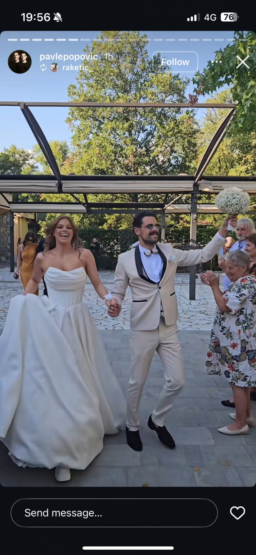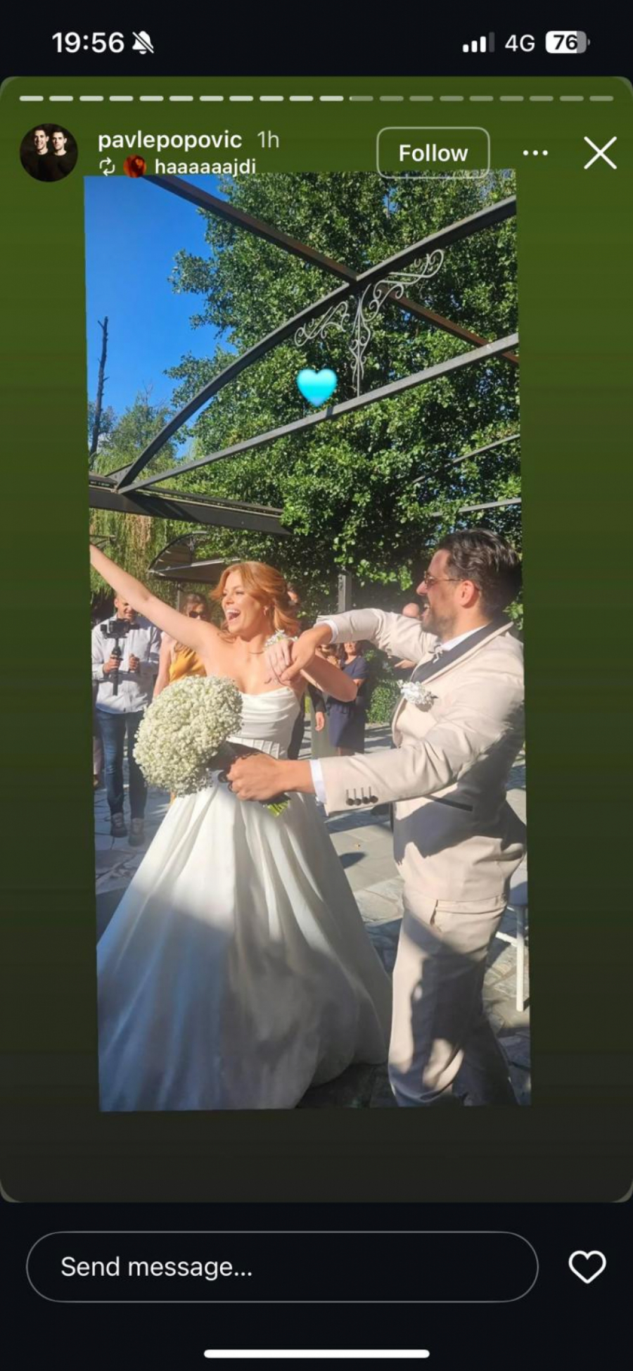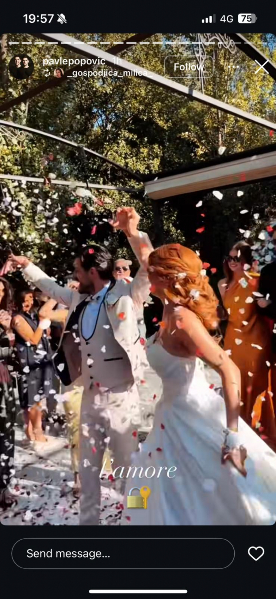 Mlada se pojavila u beloj venčanici i imala je opuštenu pletenicu ispod koje su se prepletali biseri, dok se Pavle odlučio za krem odelo, koje je po rubovima imalo crne detalje, a ceo stajling zaokružio je leptir mašnom.