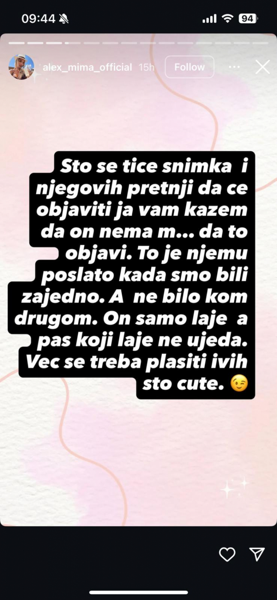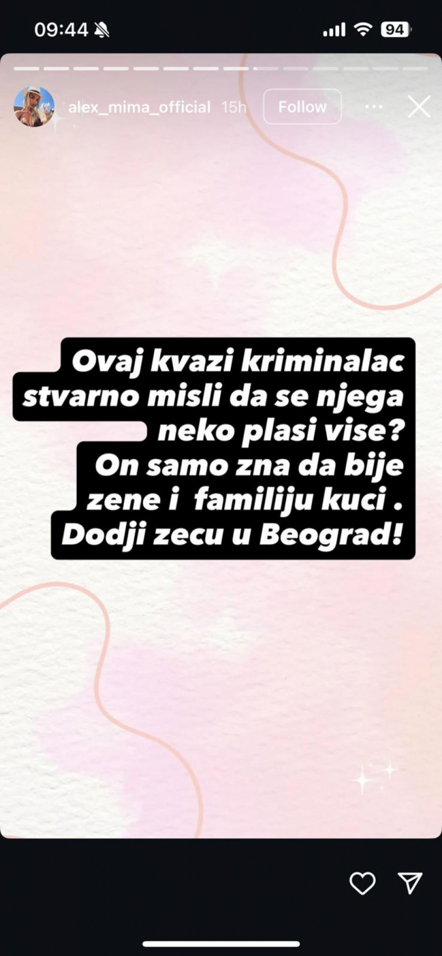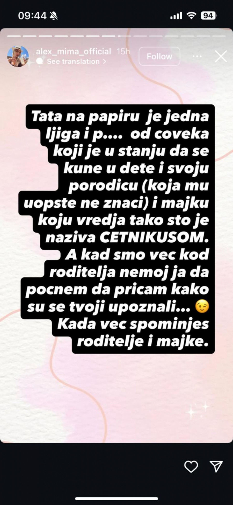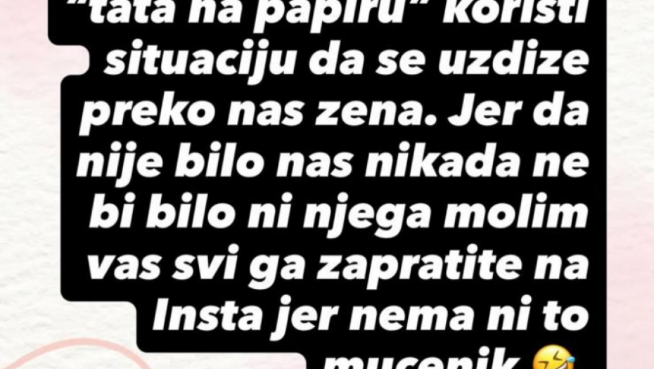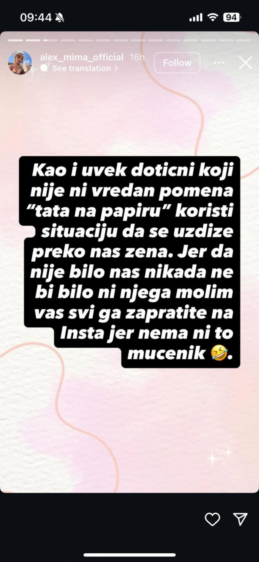 - Kao i uvek dotični koji nije ni vredan pomena, "tata na papiru" koristi situaciju da se uzdiže preko nas žena. Jer da nije bilo nas, nikada ne bi bilo ni njega. Molim vas, svi ga zapratite na Instagramu jer nema ni to mučenik - napisala je Aleks uz emotikon koji plače od smeha, pa je na narednim storijima dodala: