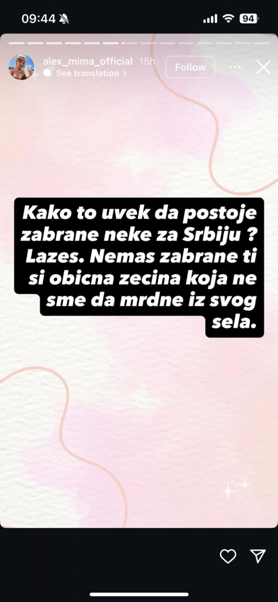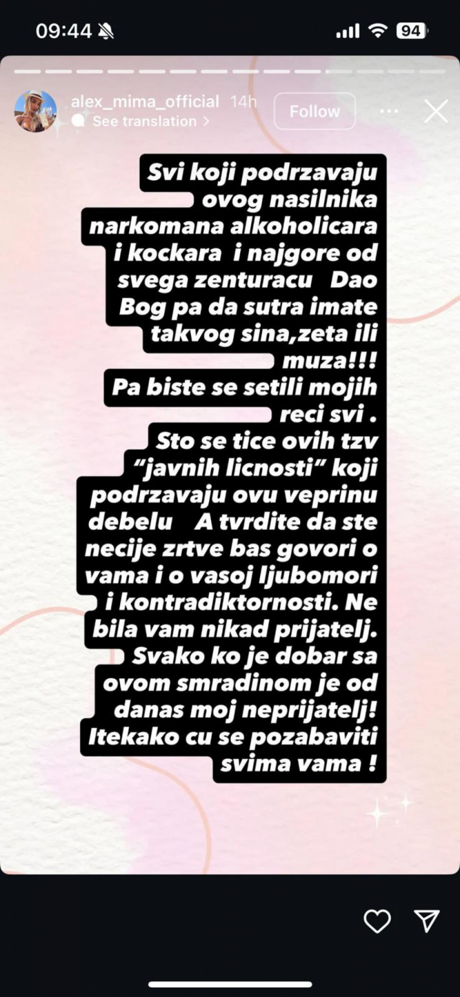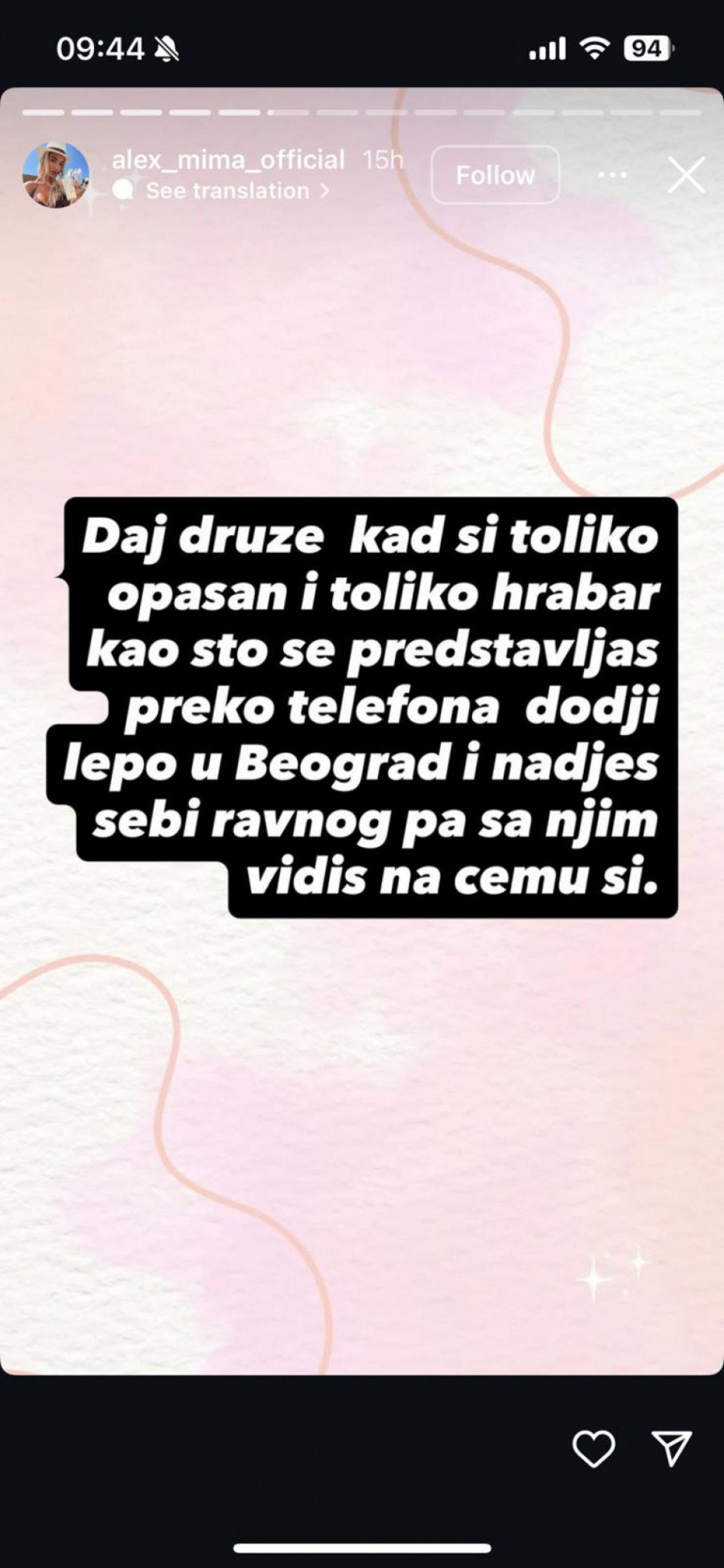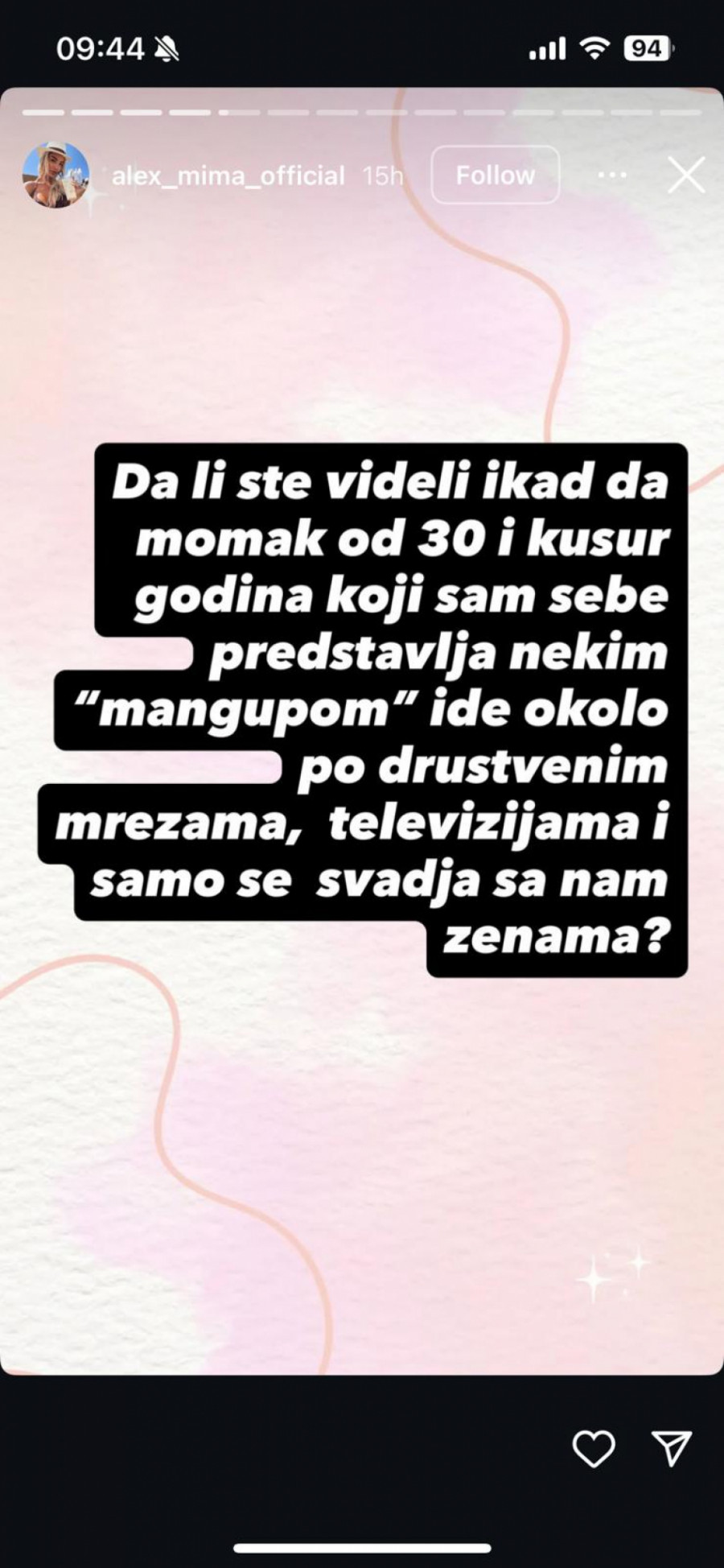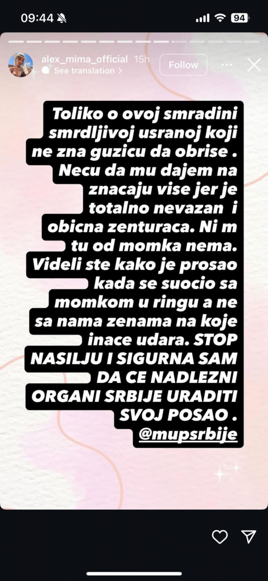 - Kao i uvek dotični koji nije ni vredan pomena, "tata na papiru" koristi situaciju da se uzdiže preko nas žena. Jer da nije bilo nas, nikada ne bi bilo ni njega. Molim vas, svi ga zapratite na Instagramu jer nema ni to mučenik - napisala je Aleks uz emotikon koji plače od smeha, pa je na narednim storijima dodala: