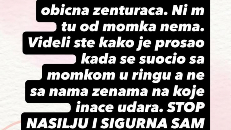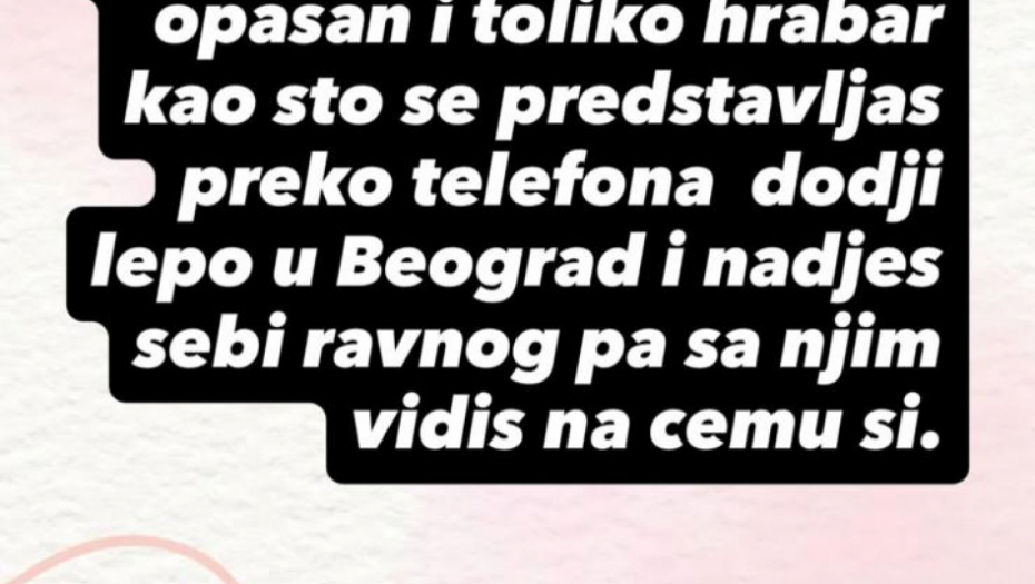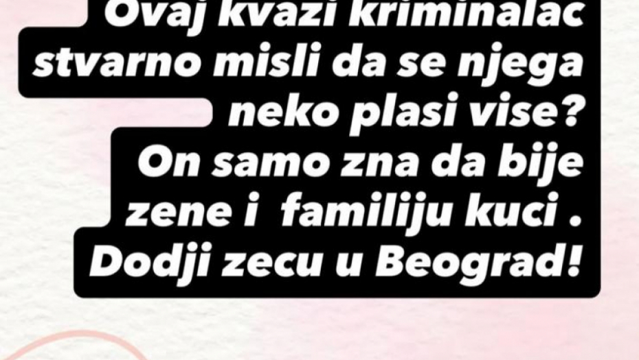 - Ovaj kvazi kriminalac stvarno misli da se njega neko plaši više?! Jedino što zna je da bije žene i familiju kući. Dođi zecu u Beograd! Toliko o ovoj smradini smrdljivoj usr*noj koji ne zna guz*cu da obriše. Neću da mu dajem na značaju više jer je totalno nevažan i obična ženturača. Ni m tu od momka nema. Videli ste kako je prošao kada se suočio sa momkom u ringu, a ne sa nama ženama na koje inače udara. Stop nasilju i sigurna sam da će nadležni organi Srbije uraditi svoj posao - zaključila je Nikolićeva.