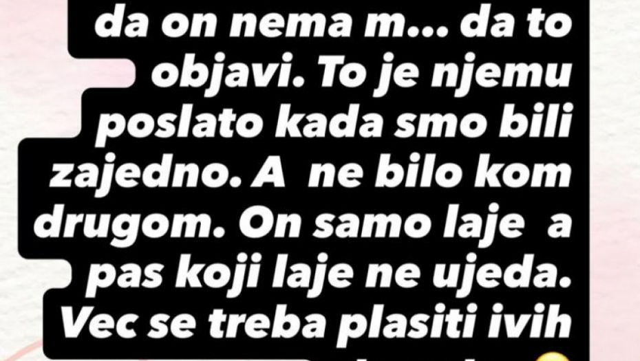 - Što se tiče snimka i njegovih pretnji da će objaviti, ja vam kažem da on nema mu*a da to objavi. To je njemu poslato kada smo bili zajedno, a ne bilo kome drugom. Samo laje, a pas koji laje ne ujeda. Više se treba plašiti ovih što ćute - nastavlja rijaliti učesnica.