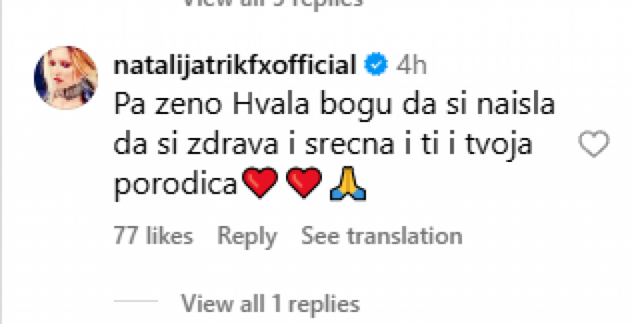 - Pa ženo, hvala Bogu da si našla da si zdrava i srećna, i ti i tvoja porodica - napisala je pevačica uz emotikone srca i ruke koje se mole.