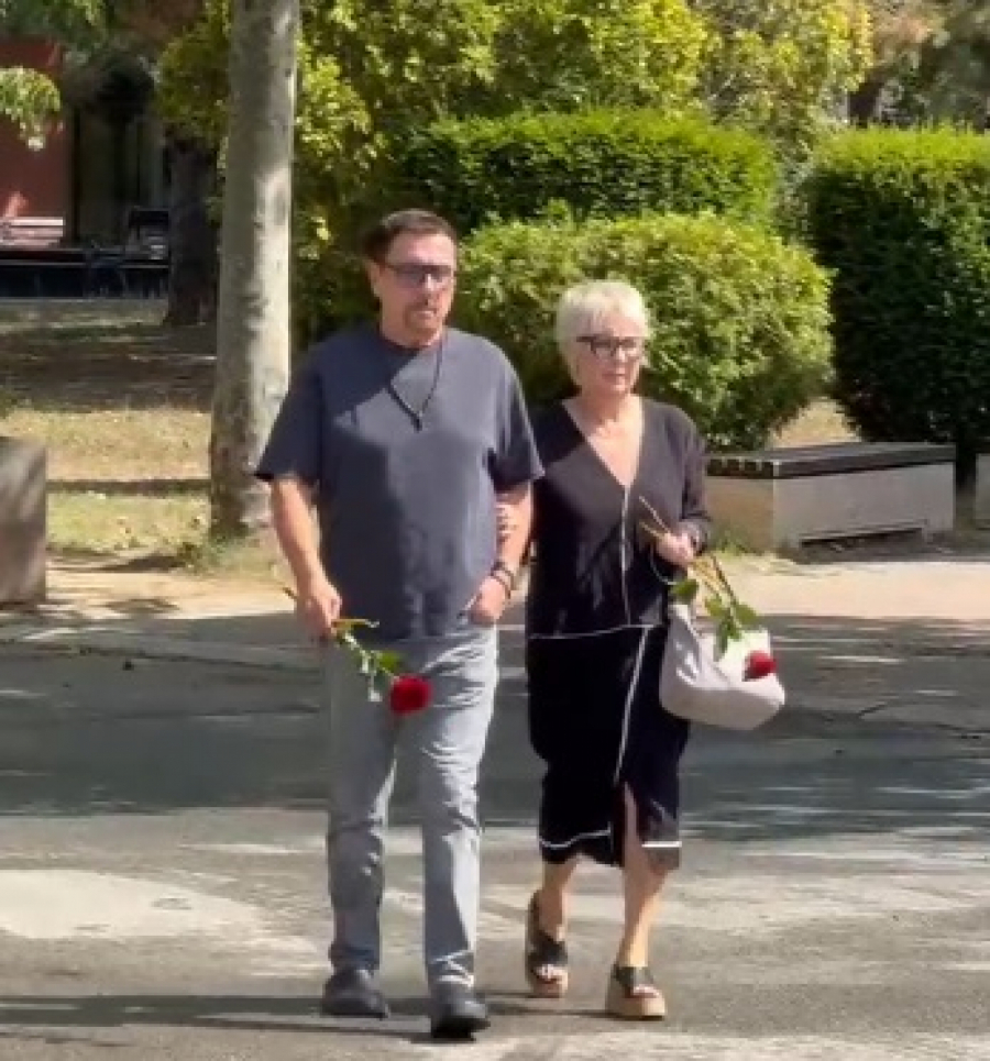 Folk muzičar nosio je u ruci crvenu ružu, kao i njegova supruga koju smo imali prilike da vidimo danas, posle toliko vremena provedenog u medijskoj ilegali.