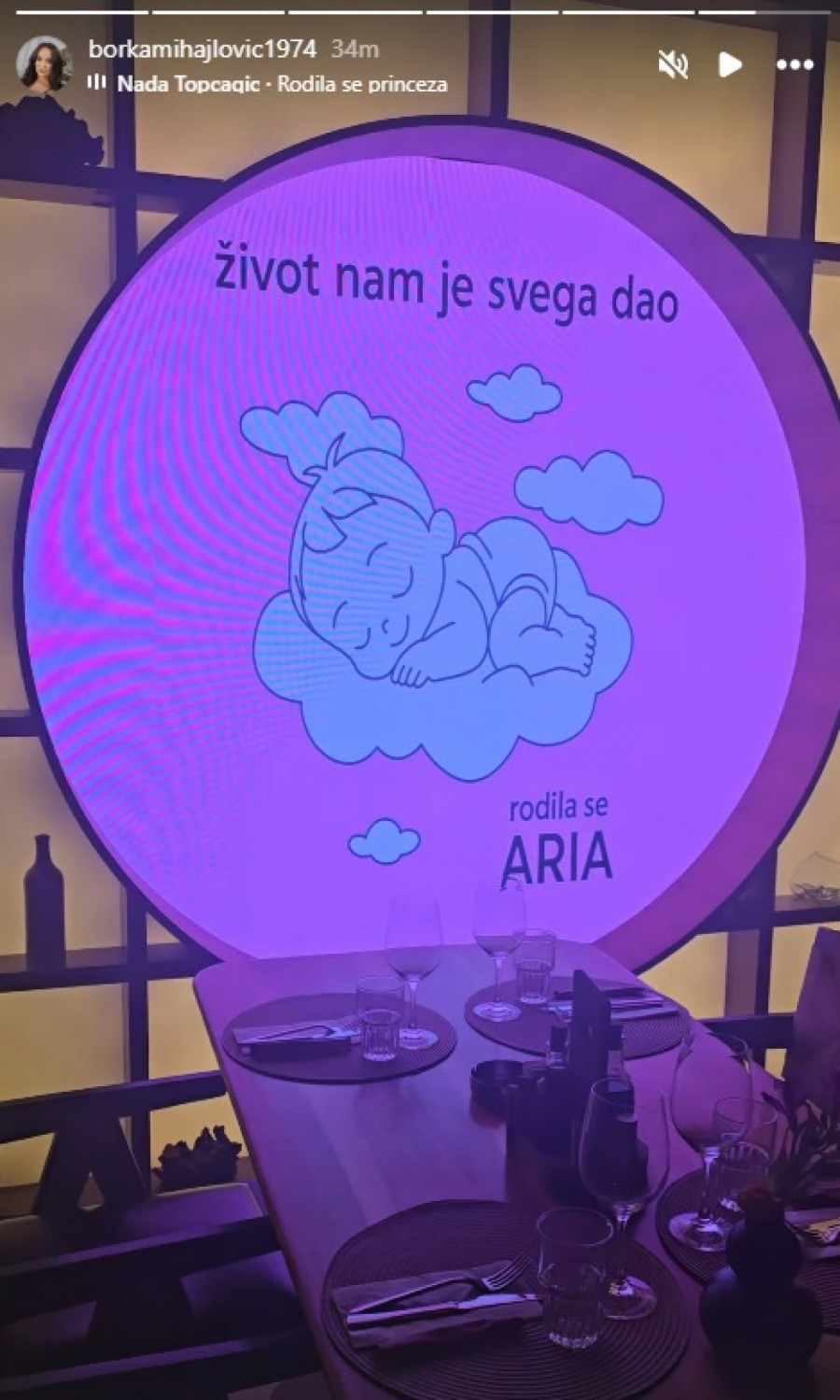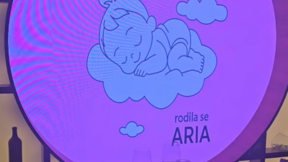 "Život nam je svega dao", piše na okruglom ramu u kome je slika bebice, a ispod nje stoji: "Rodila se Aria"