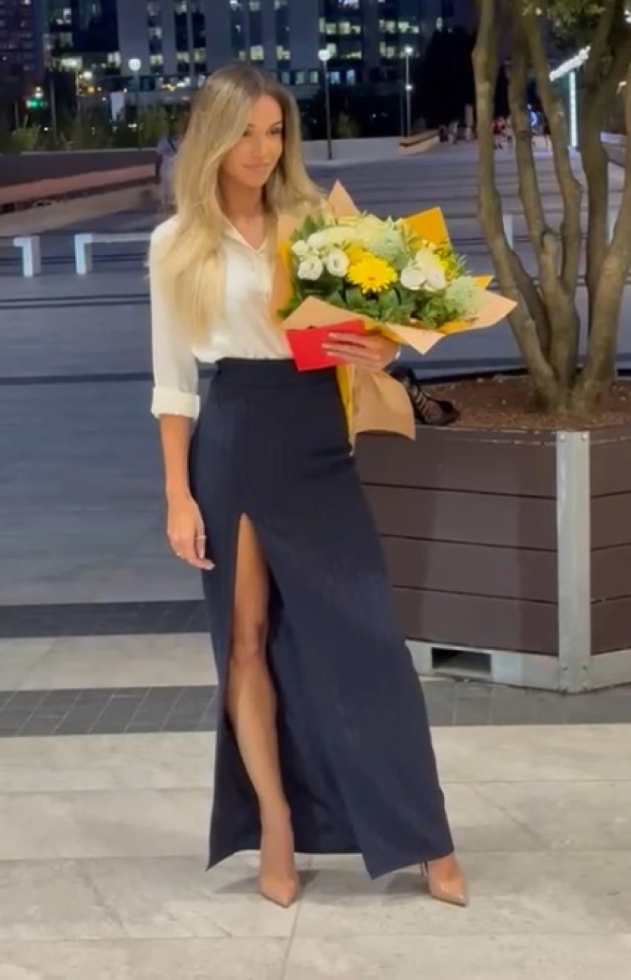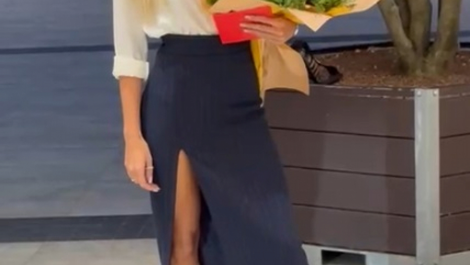 Pevačica Anđela Ignjatović Breskvica pojavila se u suknji sa šlicem do kuka, a u ruci je nosila crvenu kovertu i veliki buket cveća.