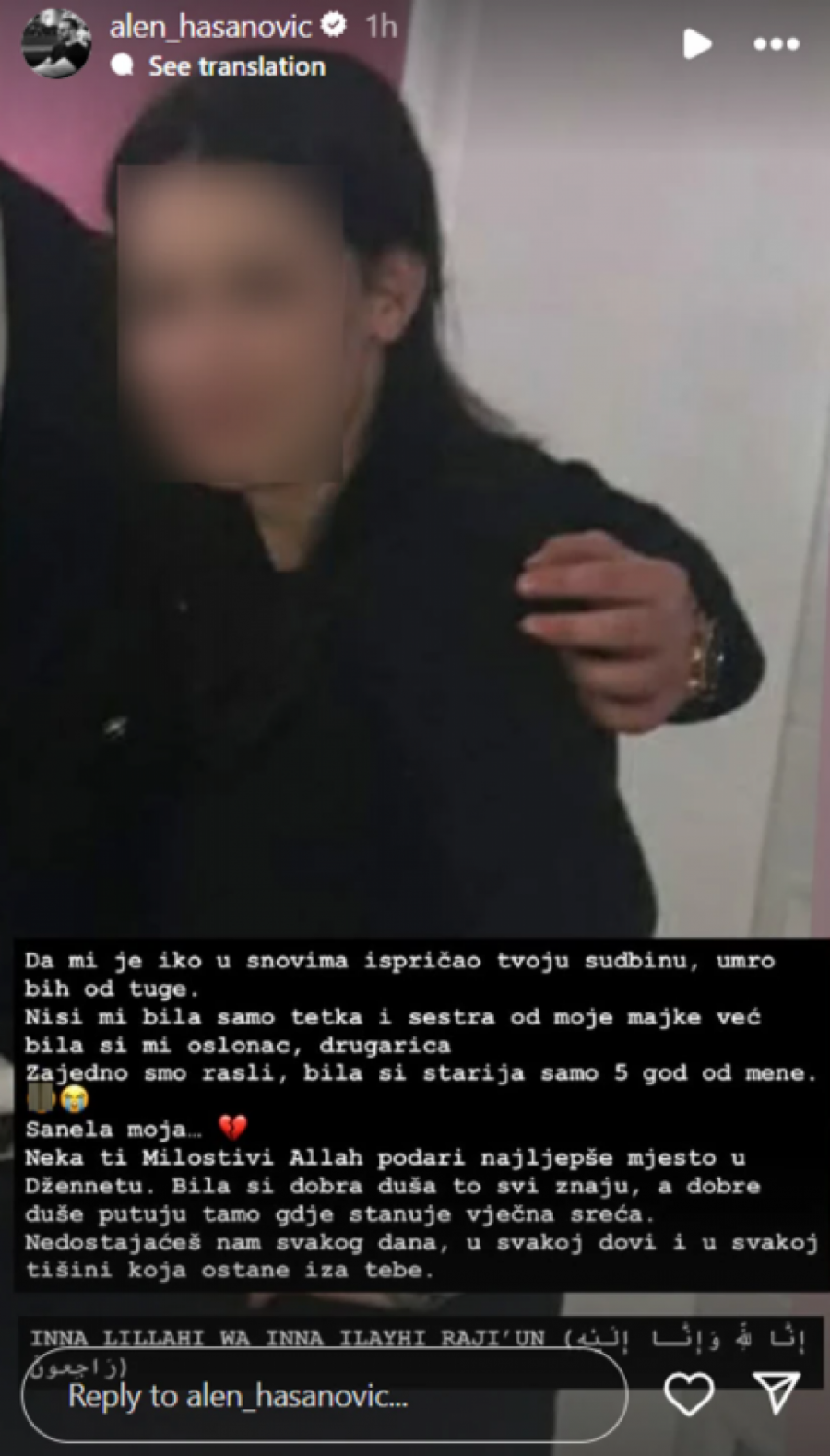 - Neka ti milostivi Allah podari najlepše mesto u dženetu. Bila si dobra duša, a dobre duše putuju tamo gde stanuje večna sreća. Nedostajaćeš nam svakoga dana, u svakoj dovi i svakoj tišini koja ostane iza tebe - napisao je on na društvenoj mreži Instagram.