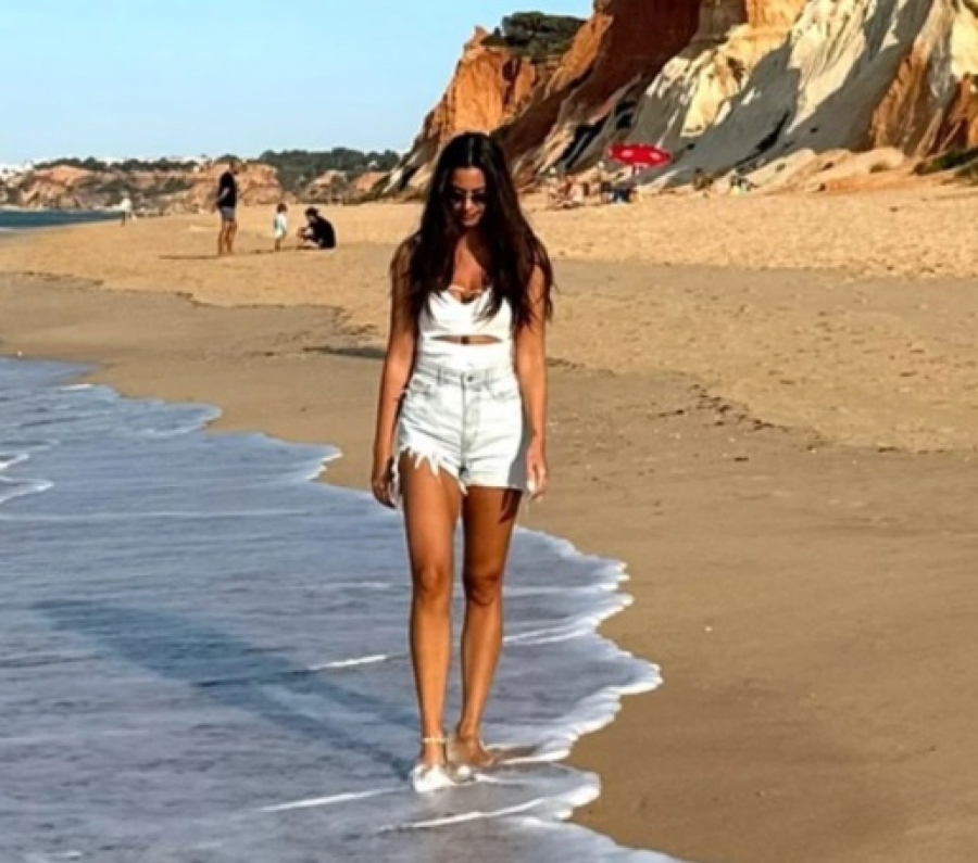 Na fotografijama sa mora, Dragana je pozirala u kompletu svetloplave boje, topu sa dugim rukavima koji otkriva njen stomak i šortsu koji ističe njene noge i preplanuli ten.