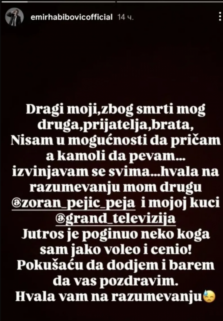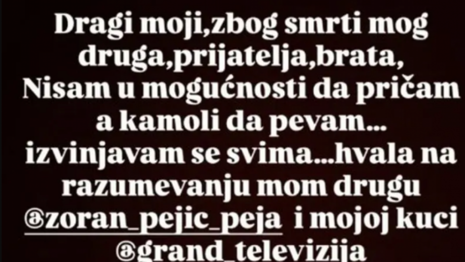 - Dragi moji, zbog smrti mog druga, prijatelja, brata nisam u mogućnosti da pričam, a kamoli da pevam. Izvinjavam se svima, hvala na razumevanju mom drugu i voditelju Zoranu Pejiću Peji i mojoj kući, Grandu. Jutros je poginuo neko koga sam jako voleo i cenio. Pokušaću da dođem i barem da vas pozdravim. Hvala na razumevanju - napisao je on.
