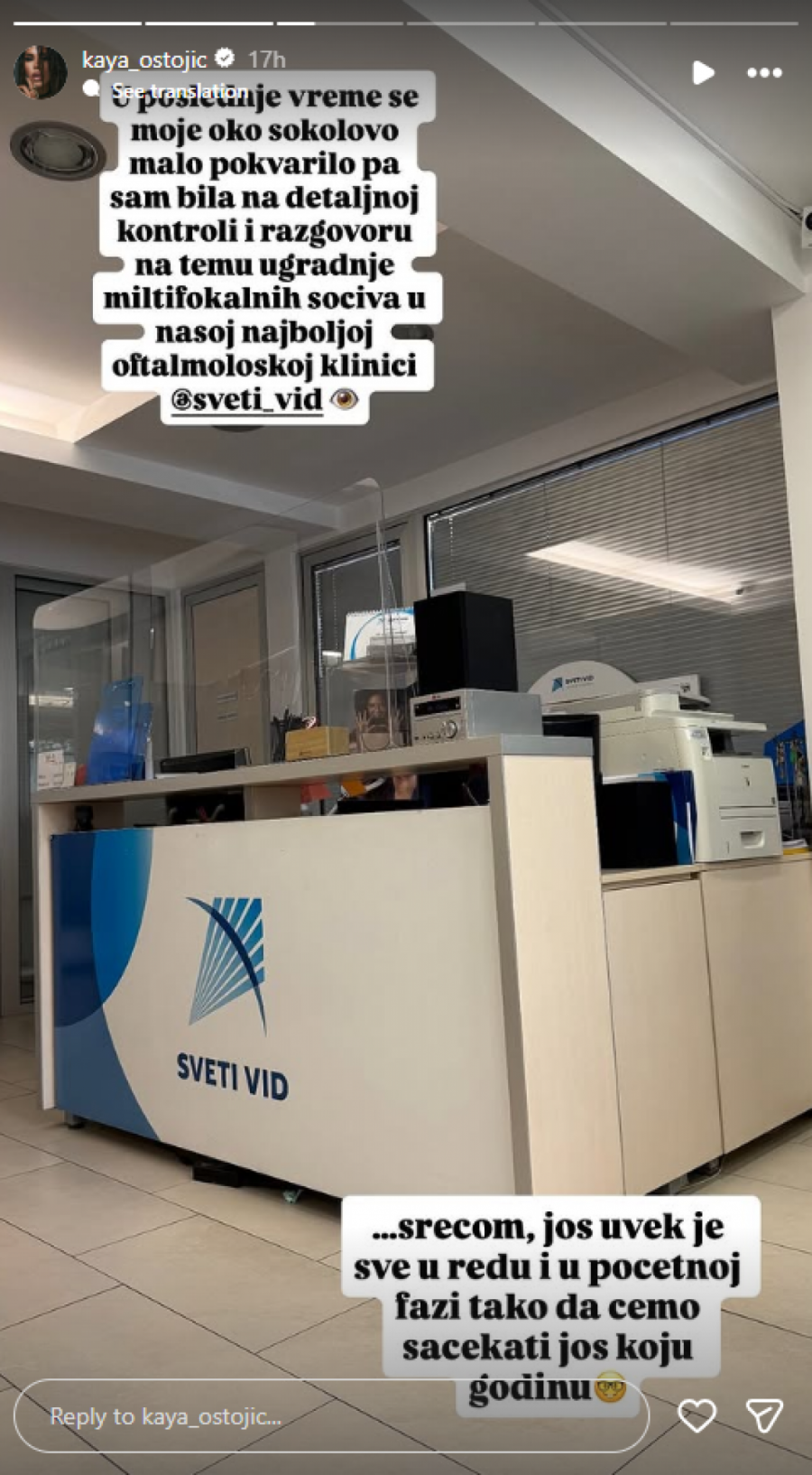 - U poslednje vreme se moje oko sokolovo malo pokvarilo, pa sam bila na detaljnoj kontroli i razgovoru na temu ugradnje multifokalnih sočiva u oftmološkoj klinici - napisala je Kaja na svom Instagramu.