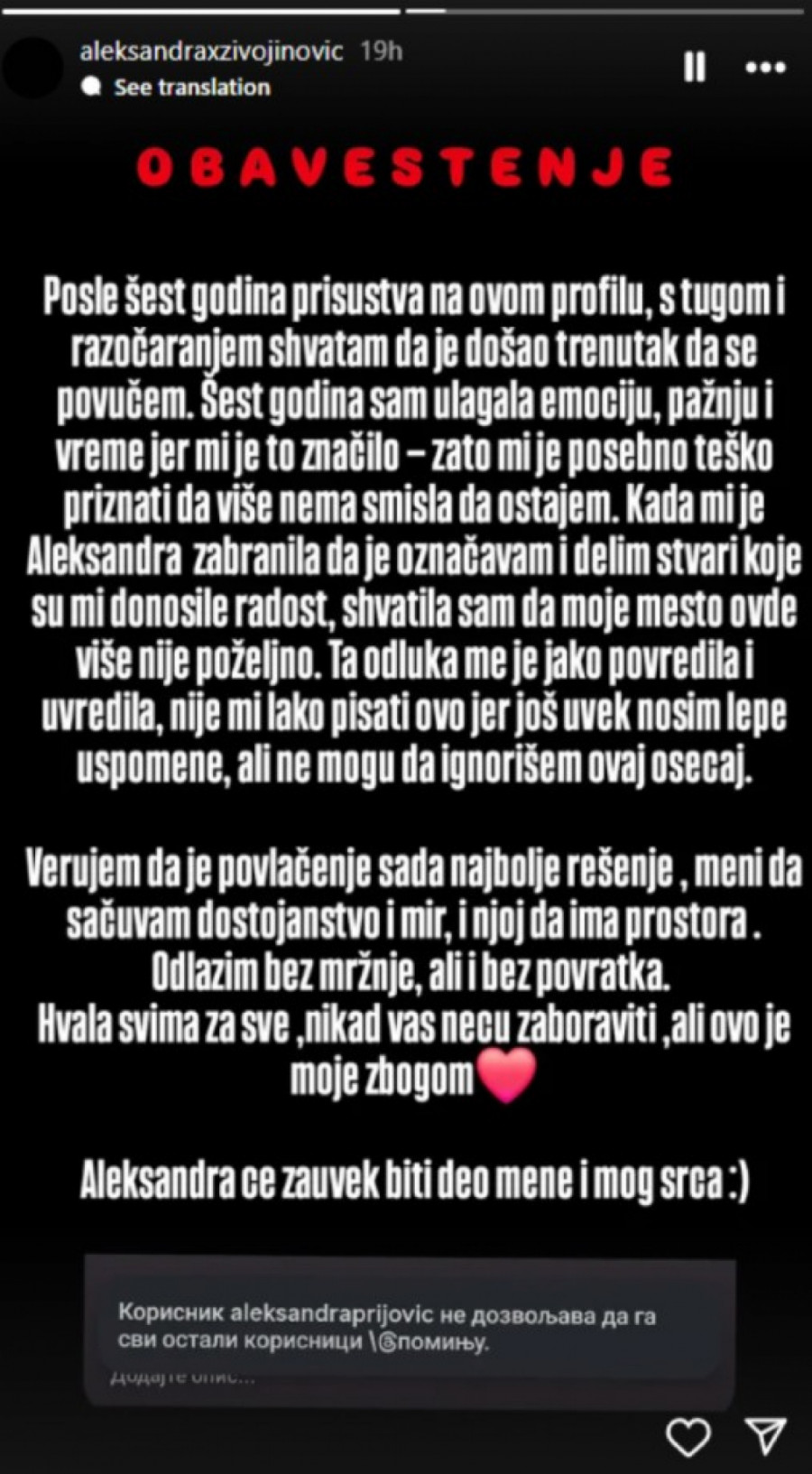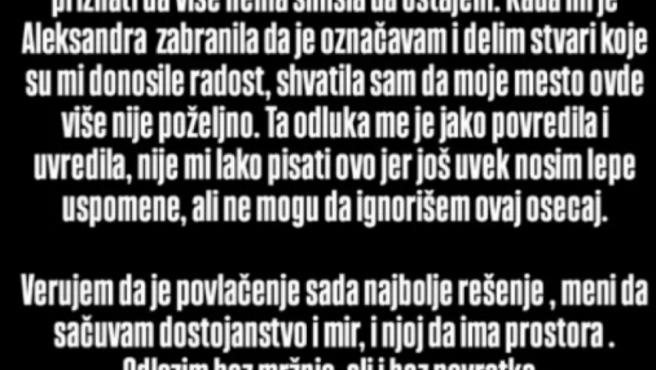 - Posle šest godina prisustva na ovom profilu sa tugom i razočaranjem shvatam da je došao trenutak da se povučem. Šest godina sam ulagala emociju, pažnju i vreme jer mi je to značilo, zato mi je posebno teško priznati da više nema smisla da ostajem. Kada mi je Aleksandra zabranila da je označavam na sadržajima koji su mi donosili radost, shvatila sam da ovde više nisam poželjna. Ta odluka me je jako povredila i uvredila. Nije mi lako da ovo pišem jer još uvek nosim lepe uspomene, ali ne mogu da ignorišem taj osećaj. Verujem da je povlačenje sada najbolje rešenje. Odlazim bez mržnje, ali i bez povratka. Hvala svima na svemu, nikad vas neću zaboraviti, ali ovo je moje zbogom. Aleksandra će zauvek biti deo mene i mog srca - poručila je obožavateljka.