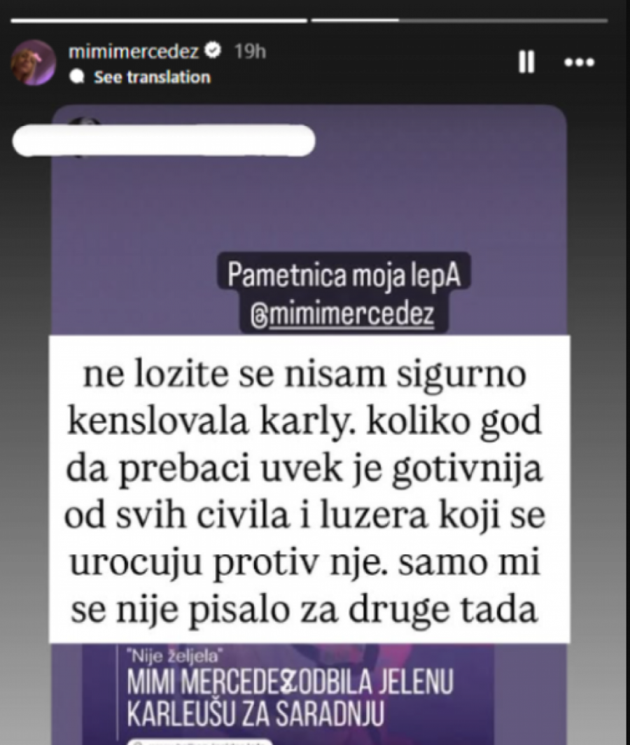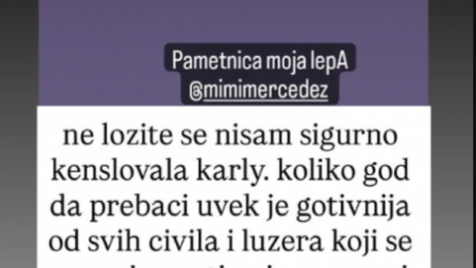 - Ne ložite se. Nisam sigurno "kenselovala" Karleušu. Koliko god da prebaci, uvek je gotivnija od svih civila i luzera koji se uroćuju protiv nje. Samo mi se tada nije pisalo za druge izvođače - poručila je Mercedez.