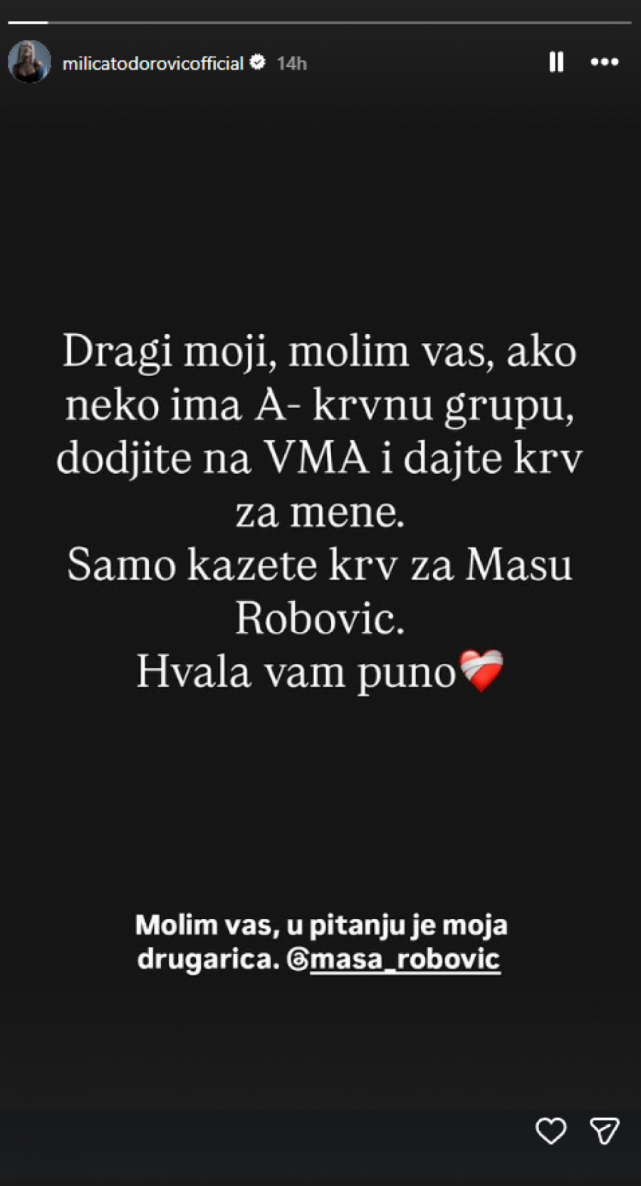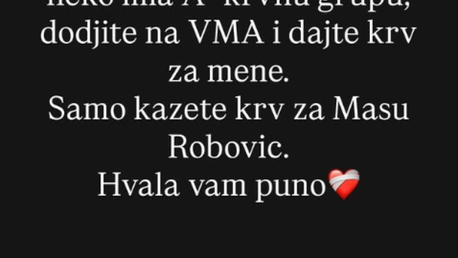 - Dragi moji, molim vas. Ako neko ima A krvnu grupu, dođite i dajte krv za mene. Samo kažite krv za Mašu Robović. Hvala vam puno - napisala je Milica i dodala: