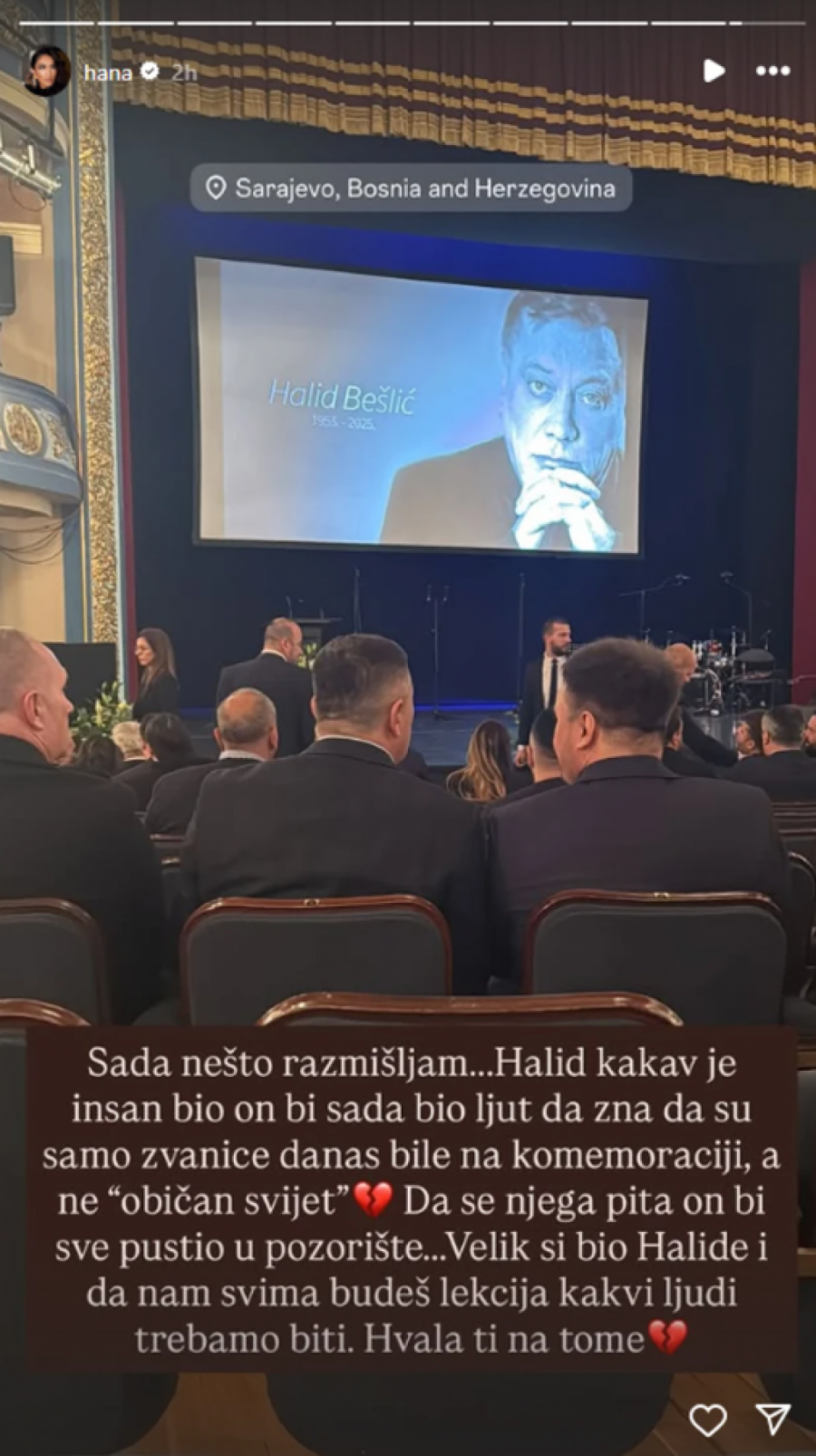 - Sada nešto razmišljam... Halid kakav je insan bio, on bi sada bio ljut da zna da su samo zvanice danas bile na komemoraciji, a ne "običan svet". Da se on pitao, sve bi pustio u pozorište. Veliki si bio, Halide i da nam svida budeš lekcija kakvi ljudi trebamo biti. Hvala ti na tome - poručila je ona na Instagramu.