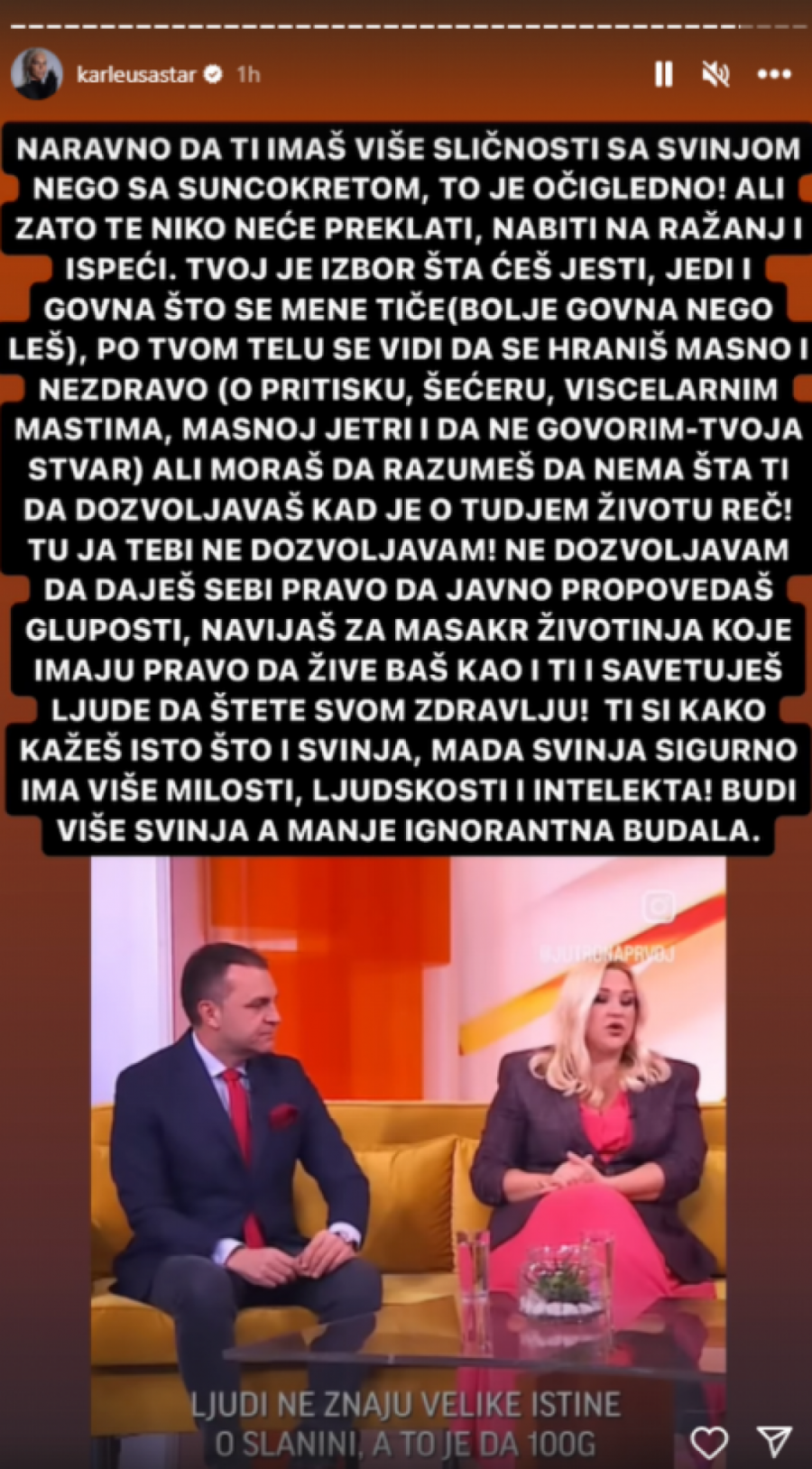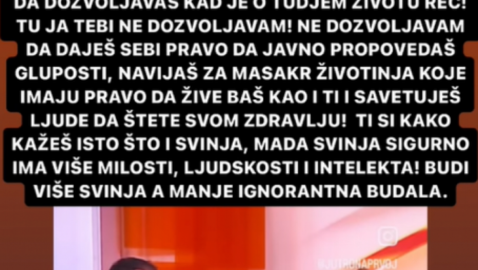 - Naravno da imaš više sličnosti sa svinjom nego sa suncokretom, to je očigledno! Ali zato te niko neće preklati, nabiti na ražanj i ispeći. Tvoj je izbor šta ćeš jesti, jedi i go**a što se mene tiče (bolje to, nego leš), po tvom telu se vidi da se hraniš masno i nezdravo (o pritisku, šećeru, mastima, masnoj jetri da ne govorim, ali tvoja stvar) Moraš da razumeš da nema šta ti da dozvoljavaš kad je o tuđem životu reč! Tu ja tebi ne dozvoljavam! Ne dozvoljavam da daješ sebi pravo da javno propovedaš gluposti, navijaš za masakar životinja koje imaju pravo da žive baš kao i ti i savetuješ ljude da štete svom zdravlju! Kako sama kažeš, ti si isto što i svinja, mada svinja sigurno ima više milosti, ljudskosti i intelekta! Budi više svinja, a manje budala - napisala je pevačica.
