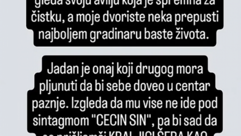 - Jadan je onaj koji drugog mora pljunuti da bi sebe doveo u centar pažnje. Izgleda da mu više ne ide pod sintagmom "Cecin sin", pa bi sada da se prišljamči kraljici šera kao njen fan. Izvini, kad sa decom budem želela da se bavim tada ću još dece i roditi, pored ćerke. Do tada, ćuti i udaraj. Za bolje i nisi. Za bolje, trebalo je da učiš od boljih, za početak imao si od koga - svog oca, a ti, po svemu sudeći, bio si ponavljač.