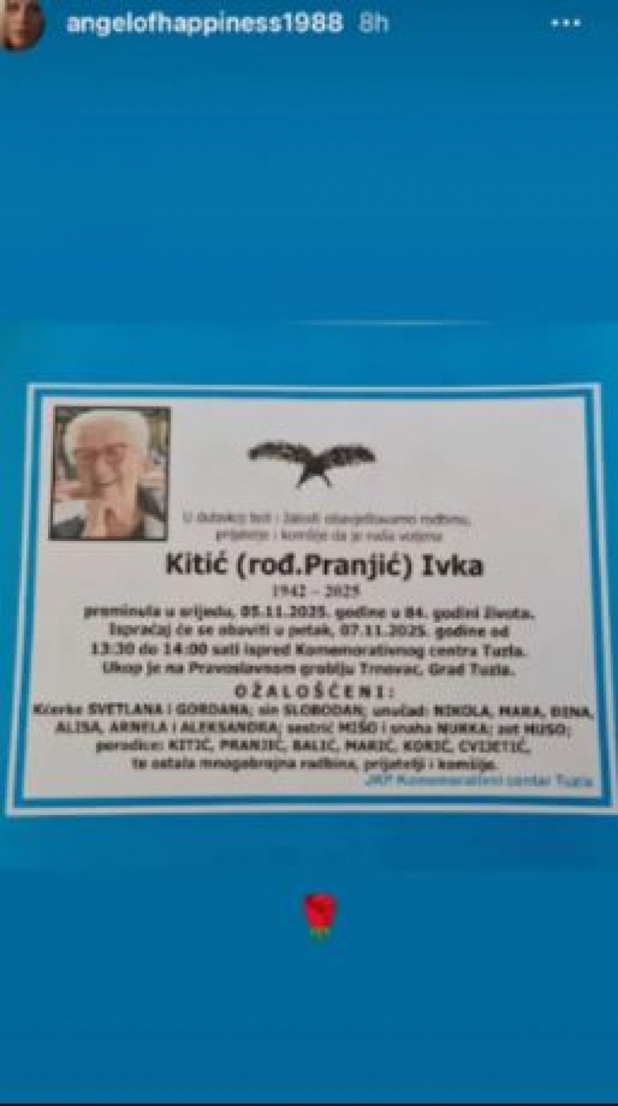 Tužnu vest objavia je Svetlanina ćerka Mara putem Instagrama, uz umrlicu i obaveštenje da će sahrana biti održana u petak u Tuzli.