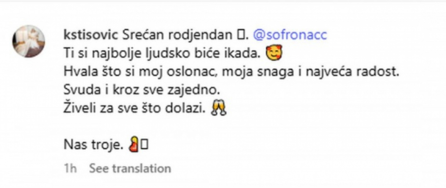 - Srećan rođendan! Ti si najbolje ljudsko biće ikada. Hvala što si moj oslonobac, moja snaga i najveća radost. Svuda i kroz sve zajedno. Živeli za sve što dolazi. Nas troje - napisala je Kosana i nagovestila da stiže novi član porodice.