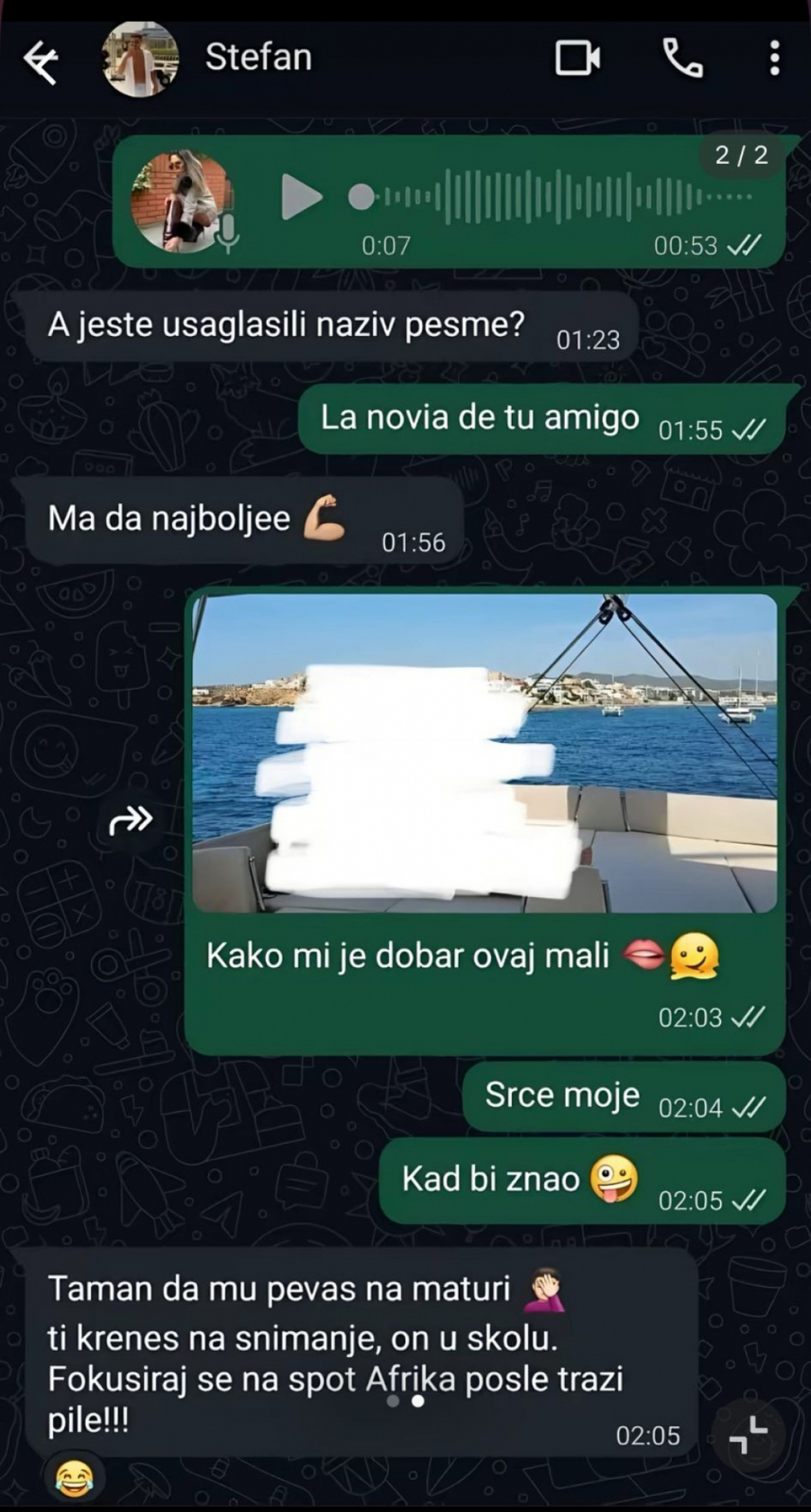- Taman da mu pevaš na maturi. Ti kreneš na snimanje, a on u školu. Fokusiraj se na spot Afrika, posle traži pile - poručio je pevačicin saradnik.
