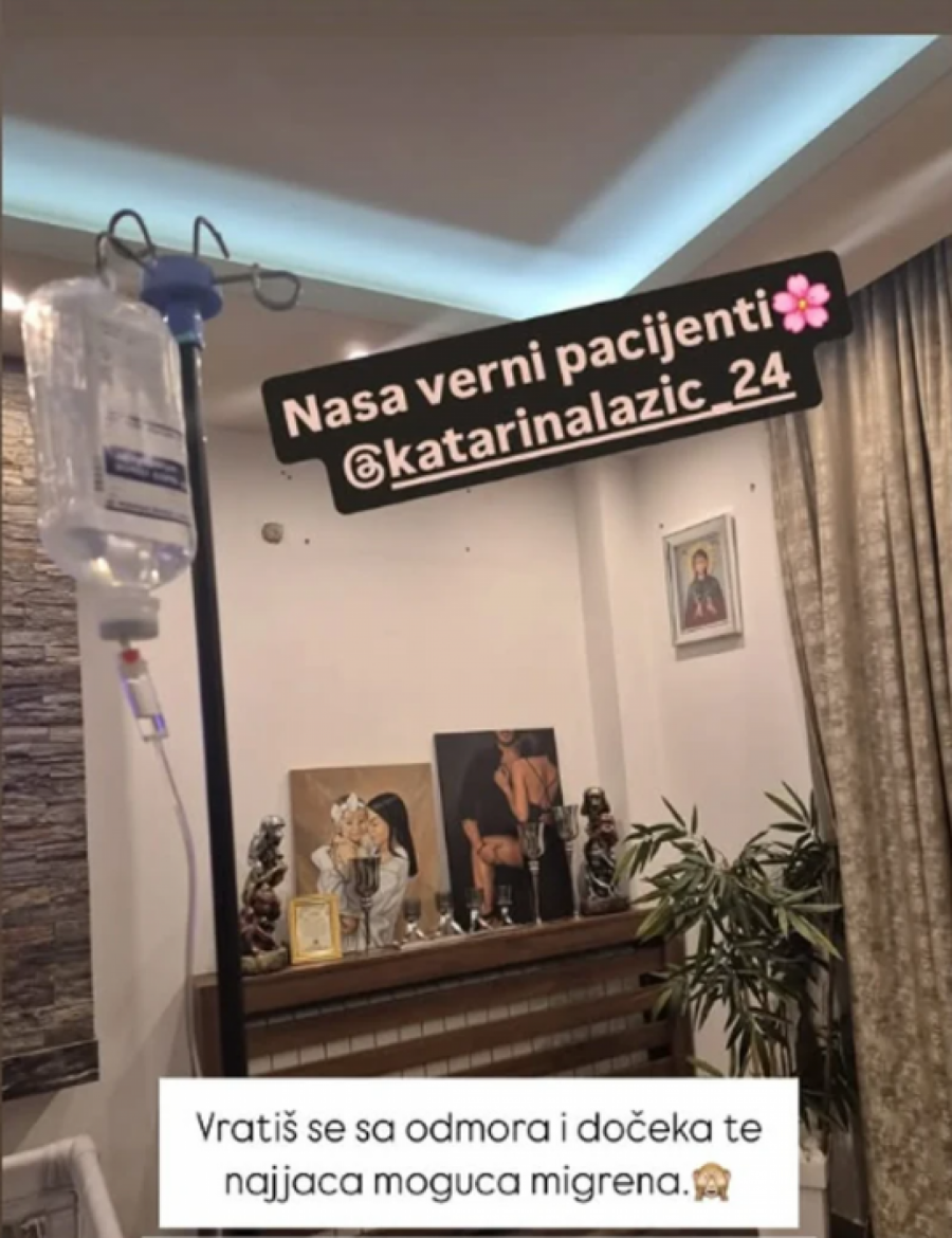 Objavila je fotografiju iz porodičnog doma na kojoj se vidi infuzija koja je pripremljena za nju. Naime, ona je pozvala stručnjake kako bi došli kod njih kući da joj priključe infuziju.