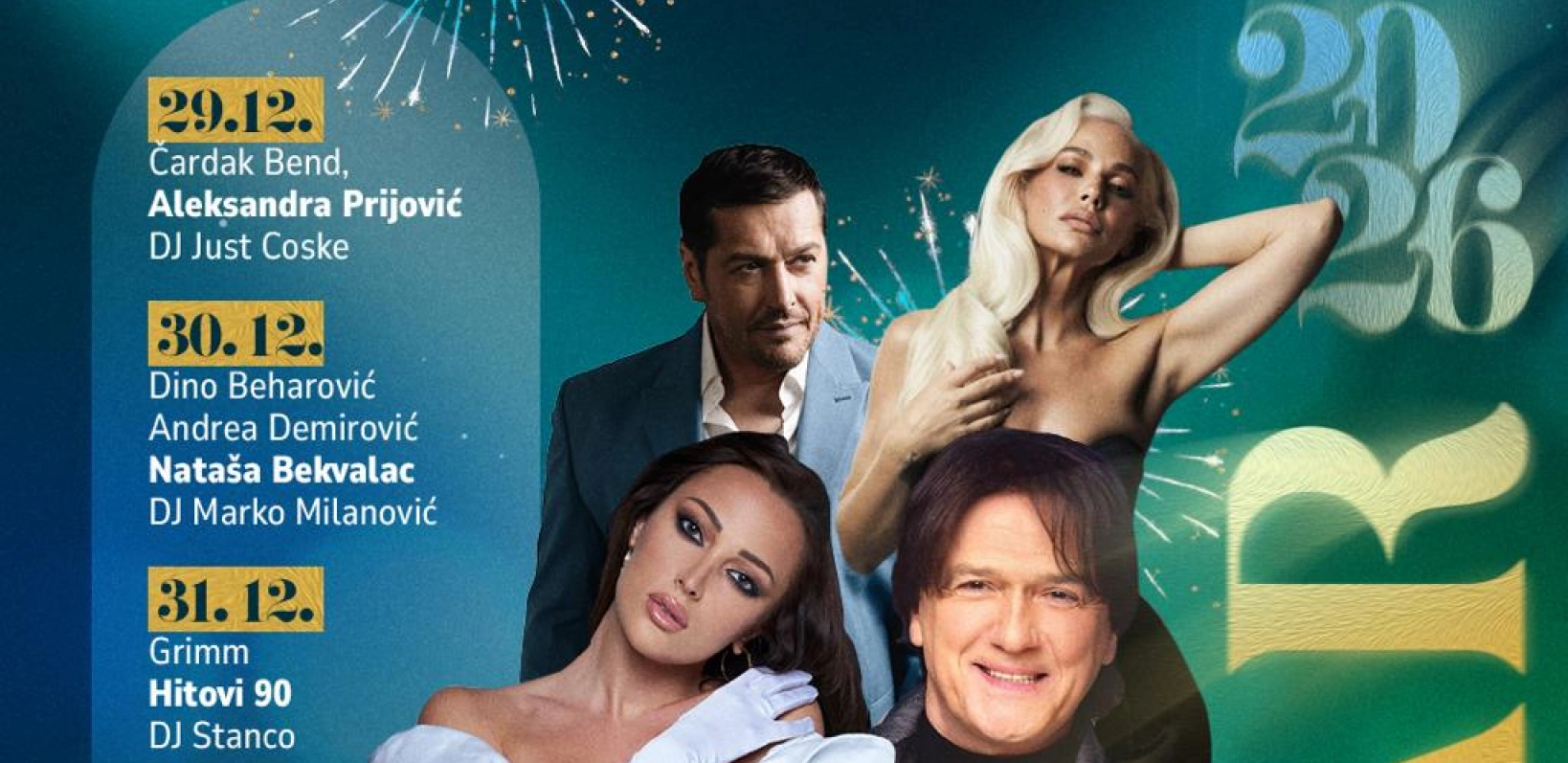 Program počinje 29. decembra nastupima Čardak benda, Aleksandre Prijović i DJ Ćoskea, već 30. decembra publiku očekuju Dino Beharović, Andrea Demirović, Nataša Bekvalac i DJ Marko Milanović, uz energične ritmove i vrhunski scenski nastup.