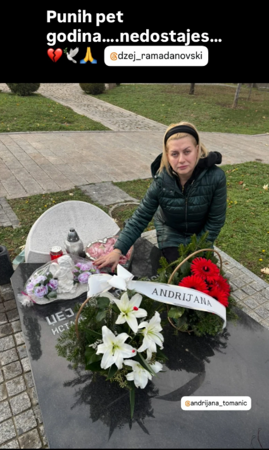 Međutim, Andrijana je danas prva došla da zapali sveću i odnese cveće Džeju. Izabrala je veliki buket na kojem je pisalo "S ljubavlju, Andrijana".