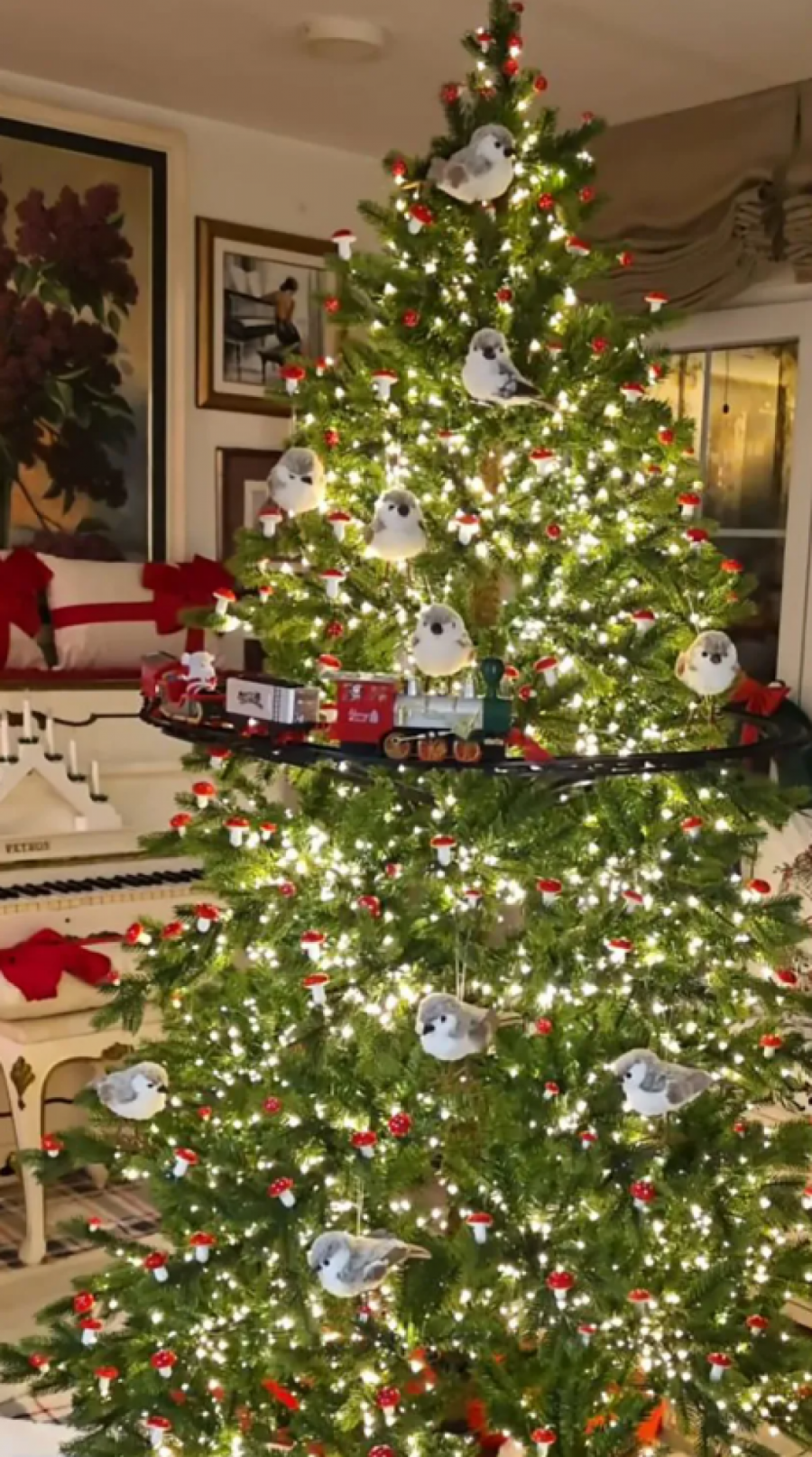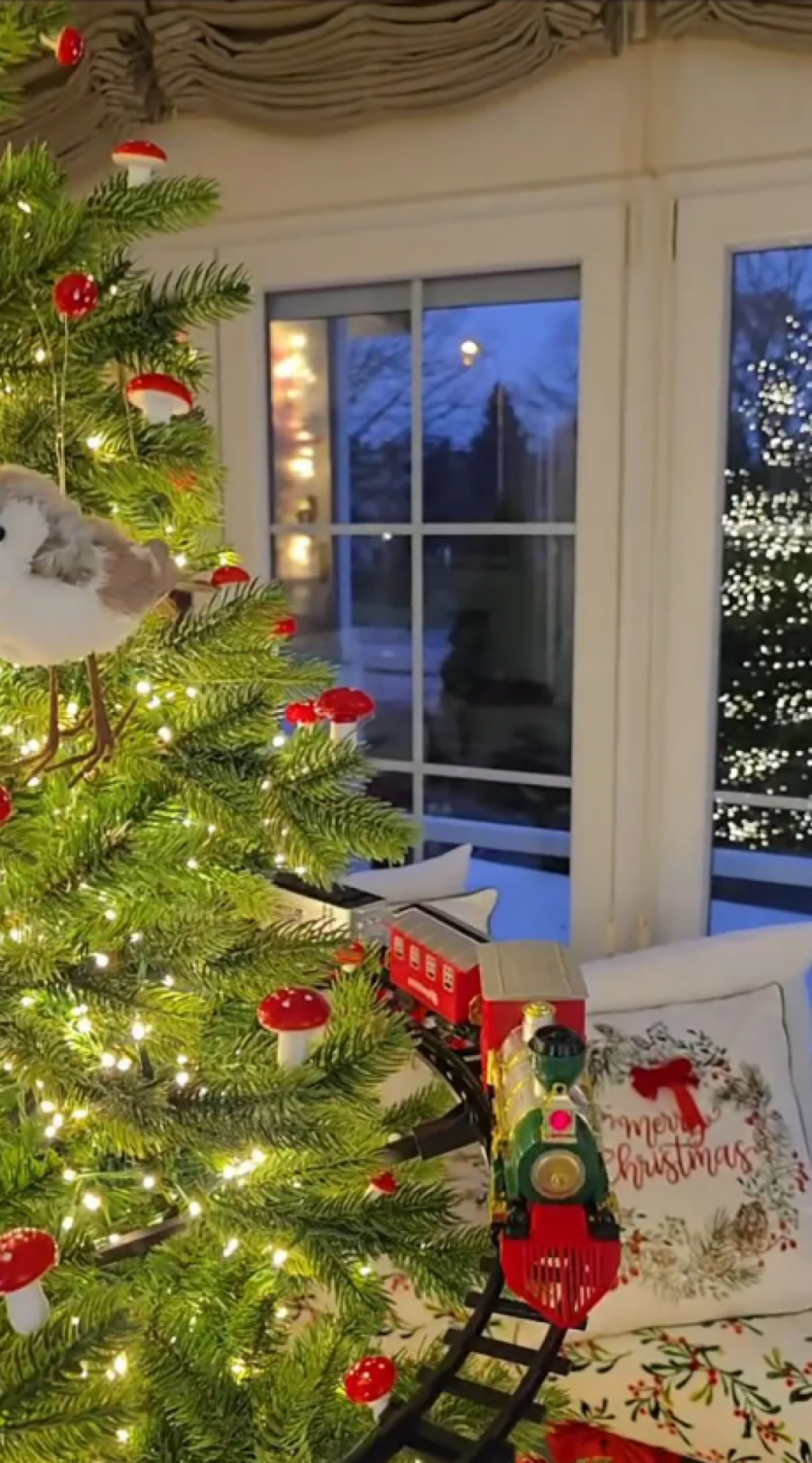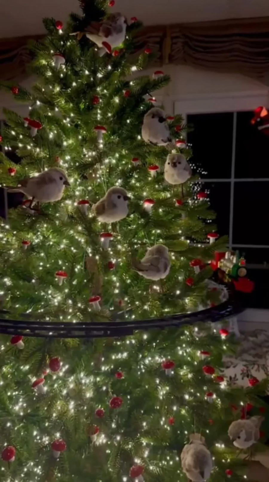 Pokazala je visoku jelku ukrašenu ptičicama, dok je oko drveta staza za voziće koji se kreću.