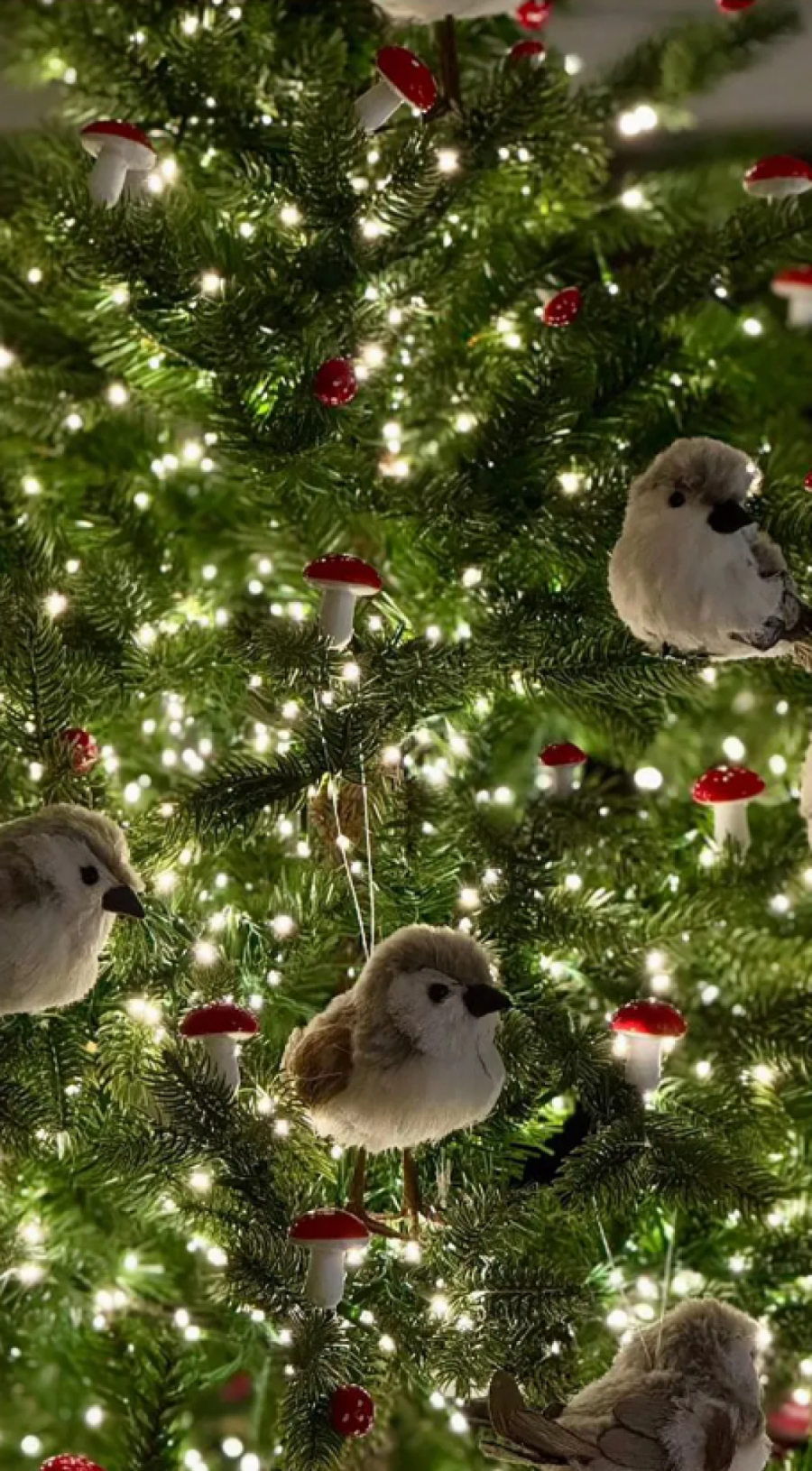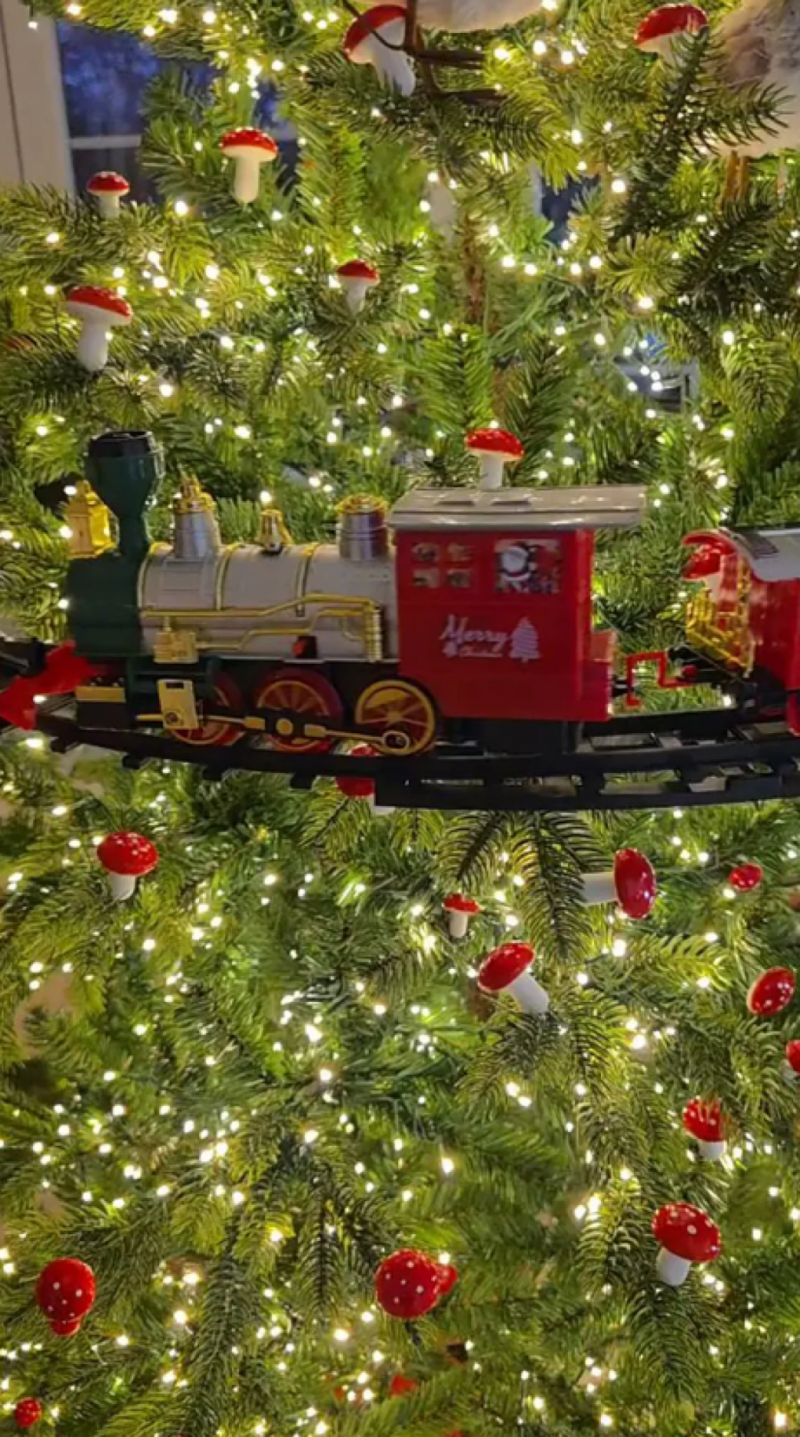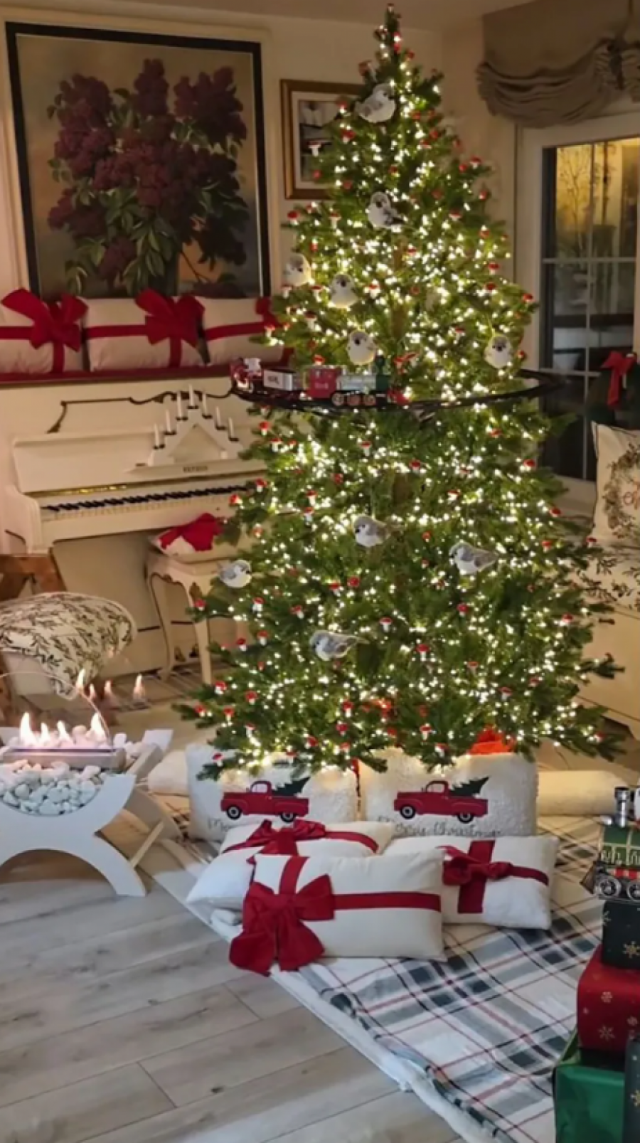 Pokazala je visoku jelku ukrašenu ptičicama, dok je oko drveta staza za voziće koji se kreću.