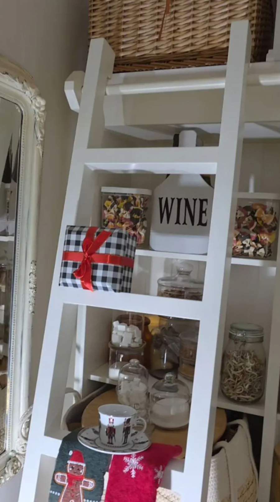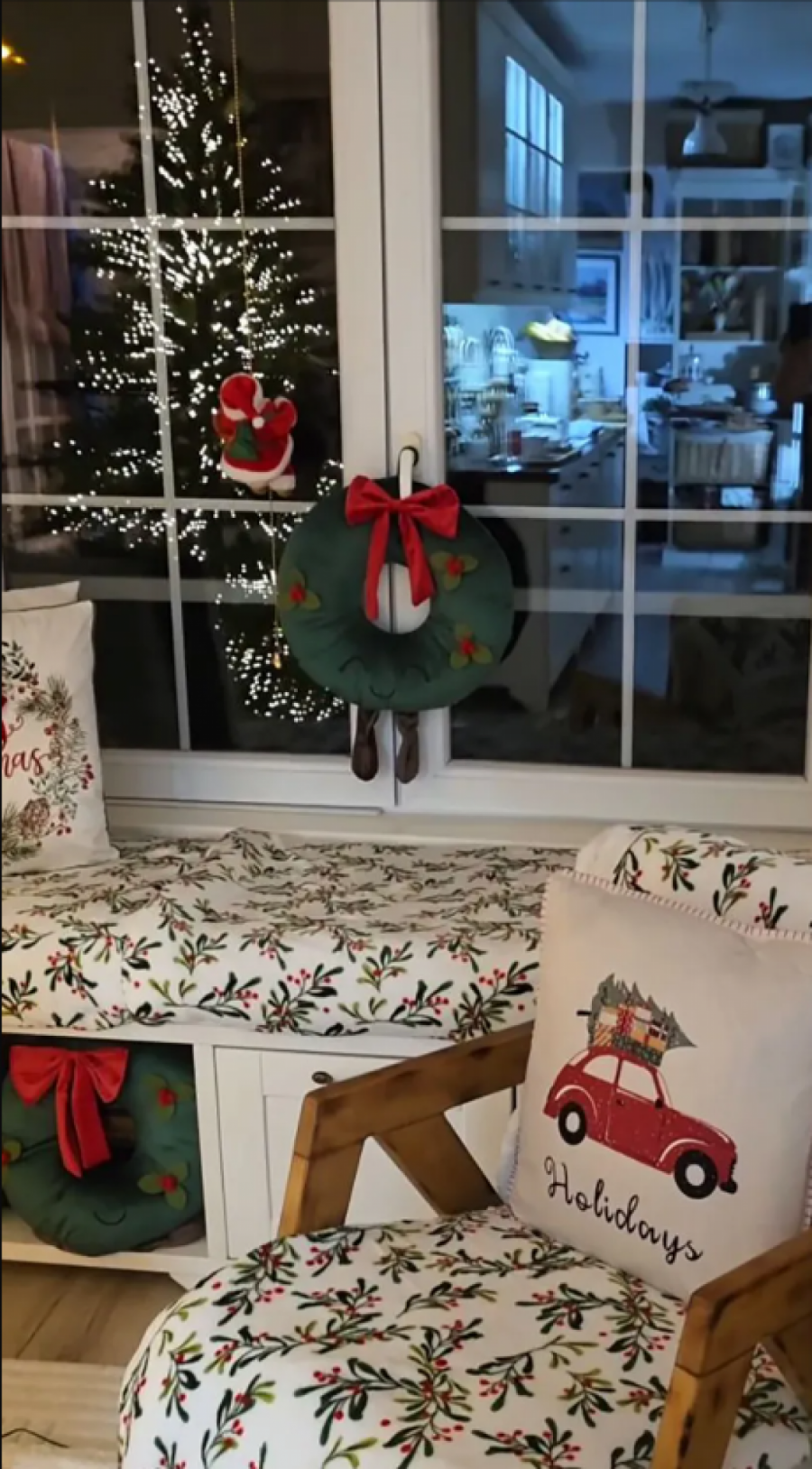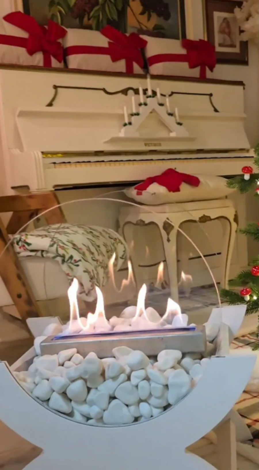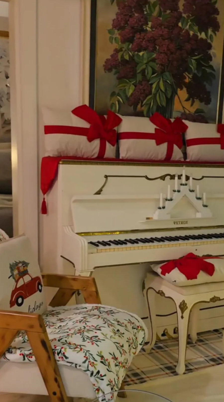 Svuda po stanu su mašne i sveće, kao i figure Deda Mraza koji se dižu i spuštaju.