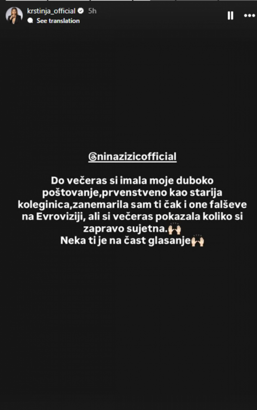 - Do večeras si imala moje duboko poštovanje, prvenstveno kao starija koleginica, zanemarila sam ti čak i one falševe na Evroviziji, ali si večeras pokazala koliko si zapravo sujetna. Neka ti je na čast glasanje, dodala je i ubrzo podelila objavu fanova: