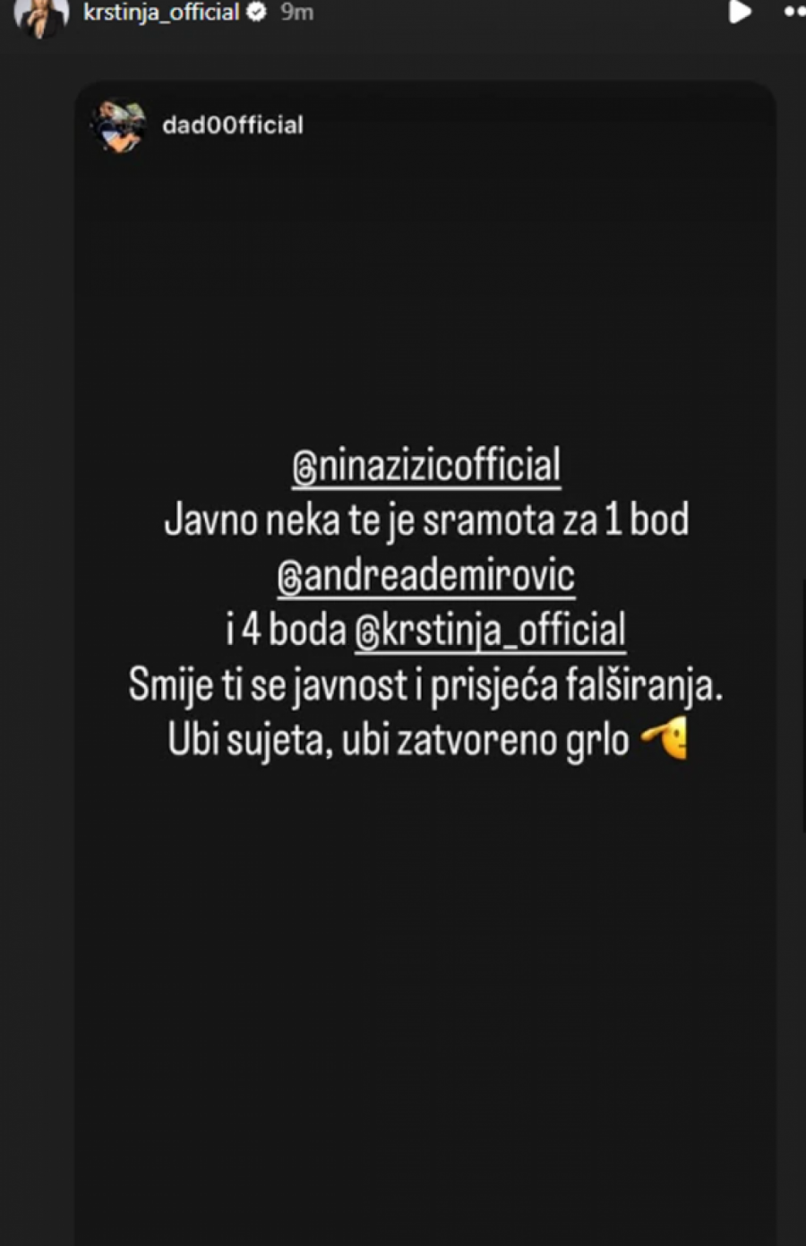 - Javno neka te je sramota za 1 bod Andrei Demirović i 4 boda za Krstinju Todorović. Smeje ti se javnost i priseća falširanja. Ubi sujeta, ubi zatvoreno grlo, dodali su.