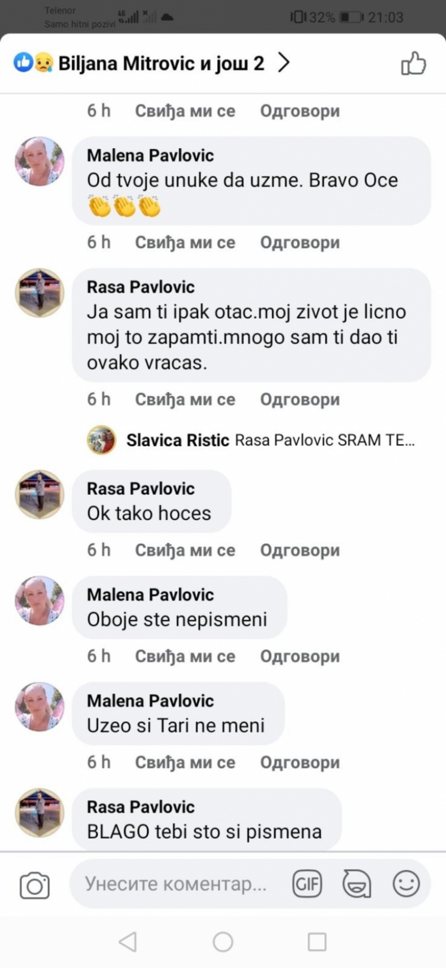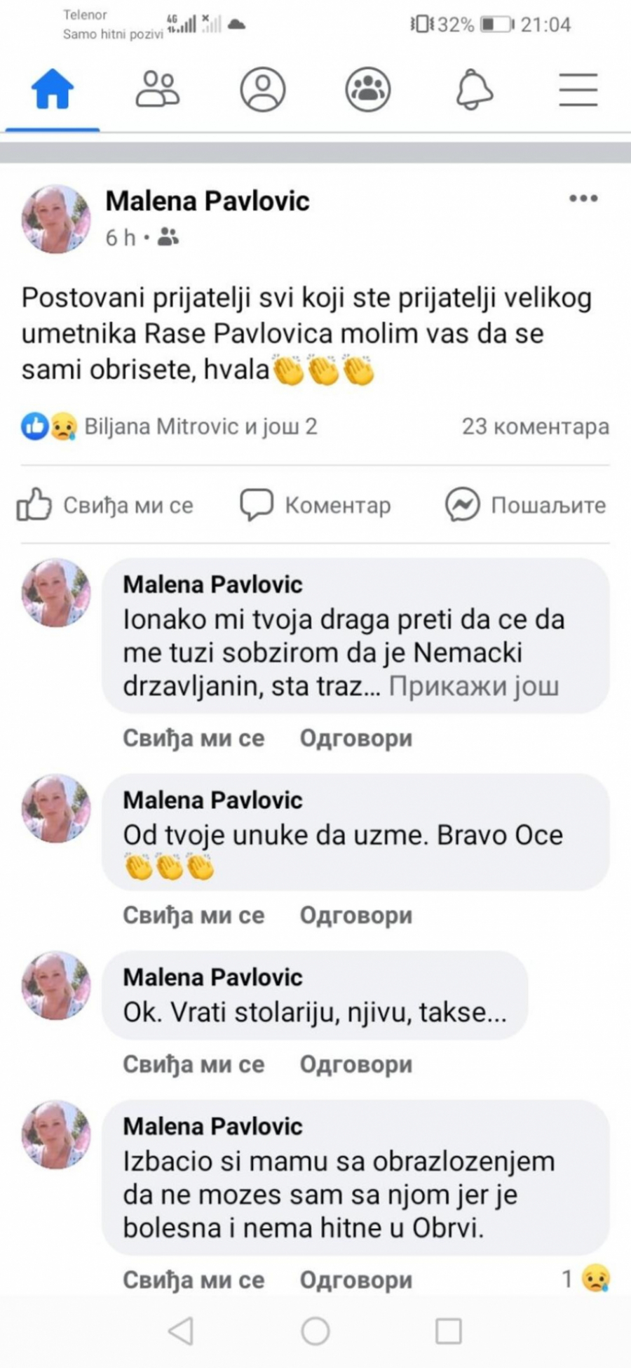 - Poštovani prijatelji, svi koji ste prijatelji velikog umetnika Raše Pavlovića, molim vas da se sami obrišete. Hvala - napisala je njegova ćerka, a njen otac se uključio u konverzaciju.