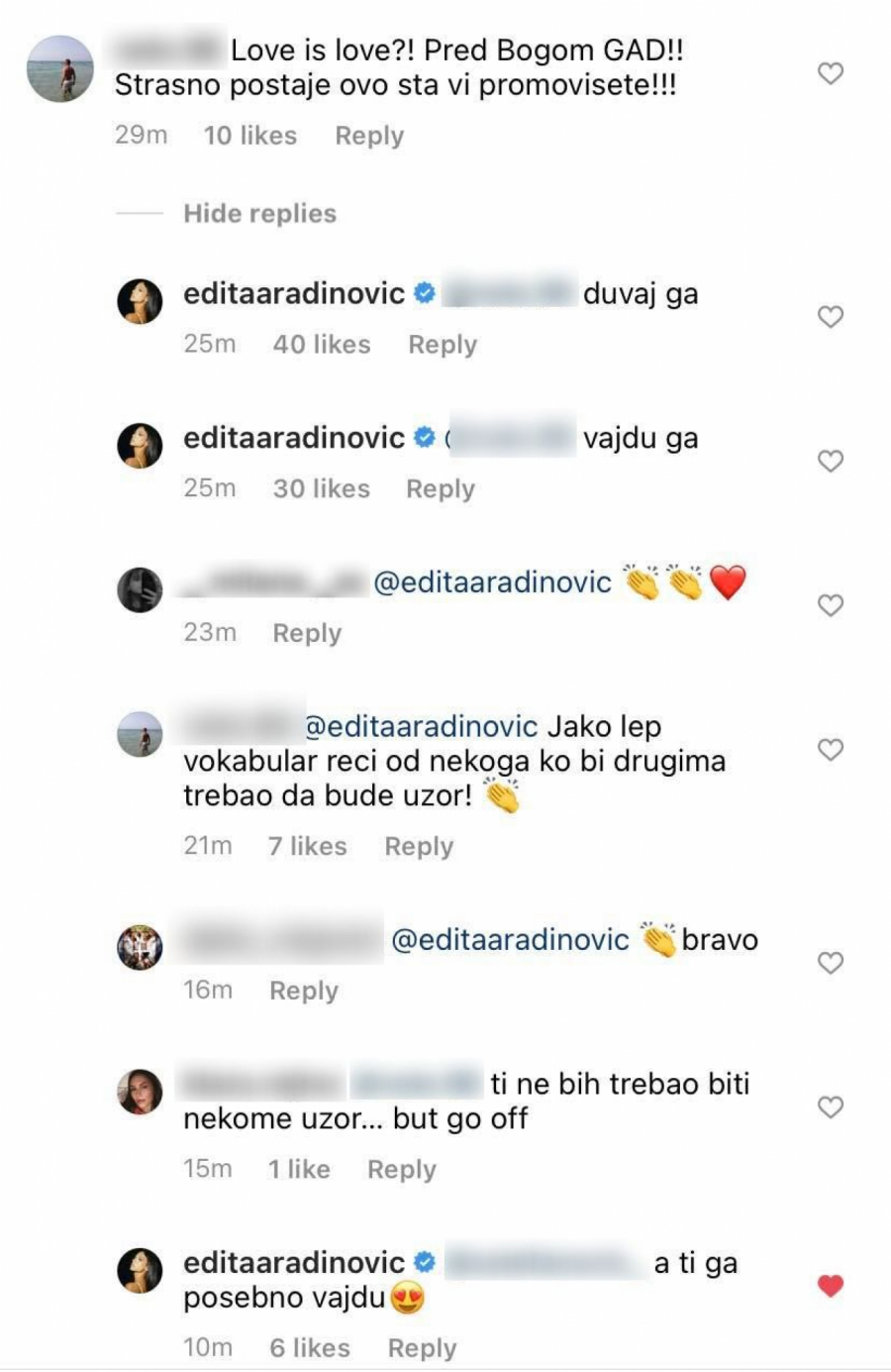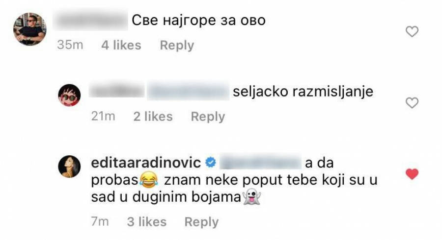 Edita je na fotografiji ispod koje su se našli skandalozni komentari, imala na sebi haltere bele boje, ali preko njih je nosila jaknu duginih boja koja je sinonim za pripadnike gay populaciju. Pevačica nikada nije krila da zbog njenih vatrenih nastupa, ali i dobrog izgleda podjednako uzdišu i muškarci i žene.