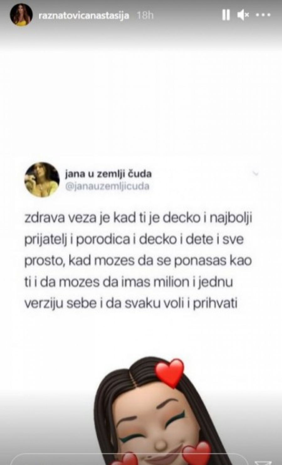 - Zdrava veza je kad ti je dečko i najbolji prijatelj i porodica i dečko i dete i sve. Prosto, kad možeš da se ponašaš kao ti i da možeš da imaš milion i jednu verziju sebe i da svaku voli i prihvata - stoji u poruci kojom je Anastasija konačno otkrila svoj idealni odnos sa partnerom, sa kojim će uskoro stati na ludi kamen, prenosi Story.rs.