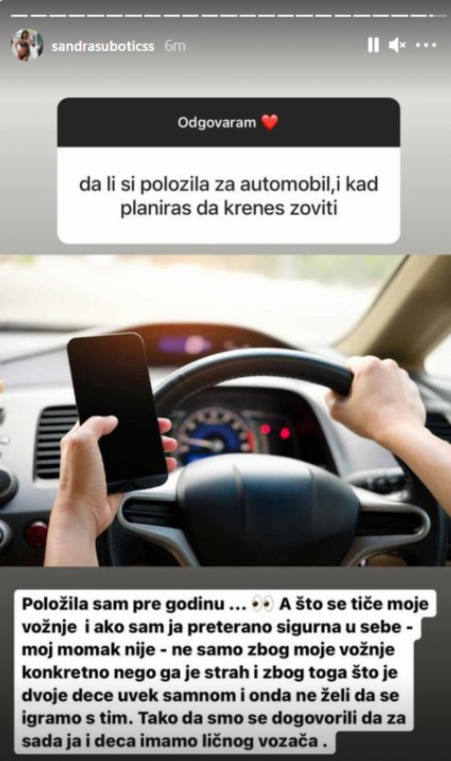 - Položila sam pre godinu dana... Ja sam preterano sigurna u sebe, ali moj momak nije. Strah ga je što je dvoje dece uvek sa mnom i ne želi da se igramo sa tim. Dogovorili smo se da deca i ja za sada imamo ličnog vozača - napisala je Aleksandra.