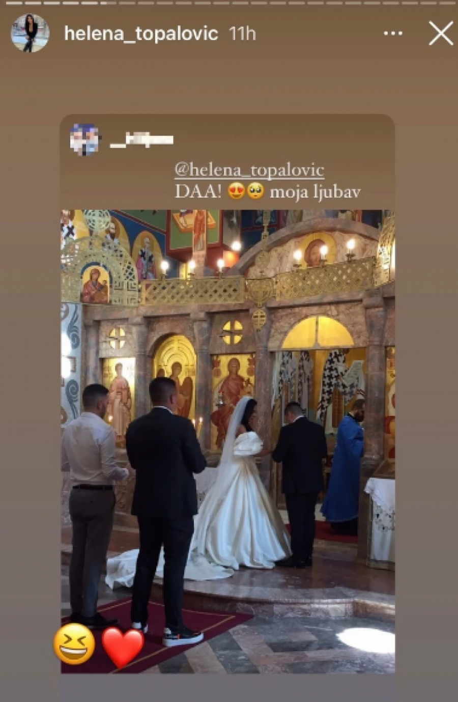 Helena je, naime, odlučila da poneki detalj sa svadbe pokaže na društvenim mrežama, pa je tako podelila fotografije sa crkvenog venčanja, dok indentitet supruga još nije želela da otkriva.