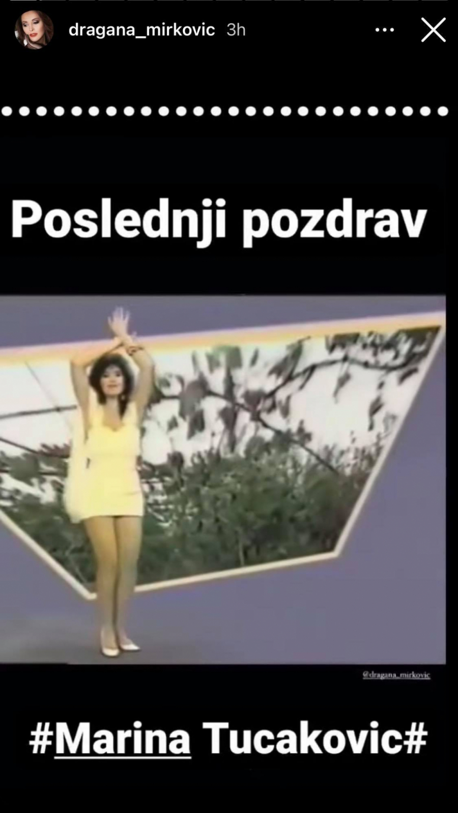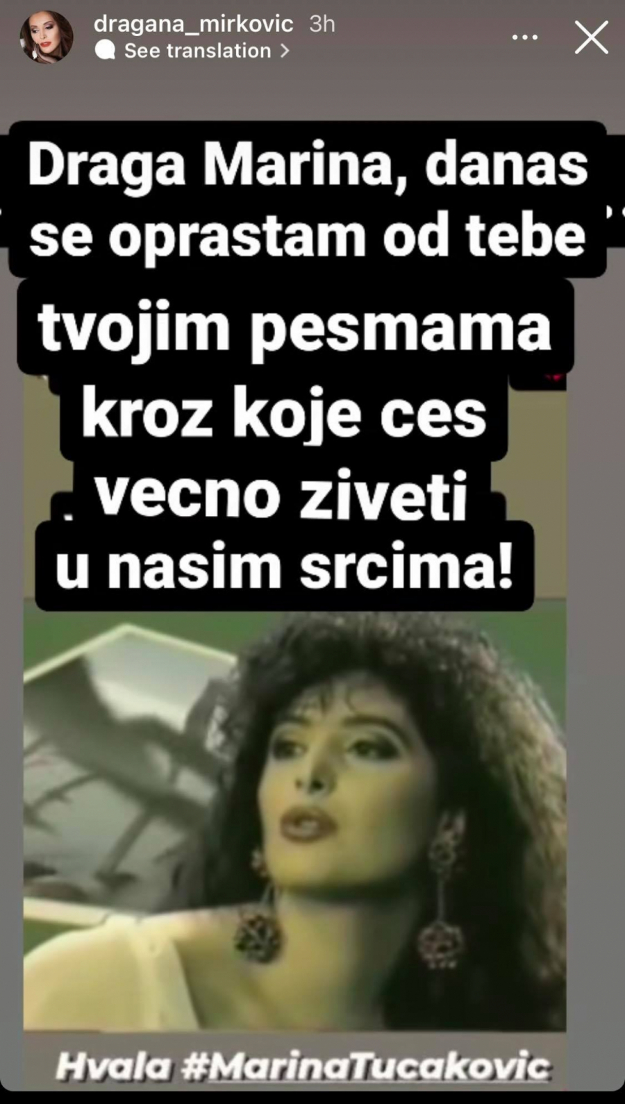 - Draga Marina, danas se opraštam od tebe tvojim pesmama kroz koje ćeš večno živeti u našim srcima. Poslednji pozdrav - napisala je Dragana emotivnu poruku na pomenutoj društvenoj mreži.