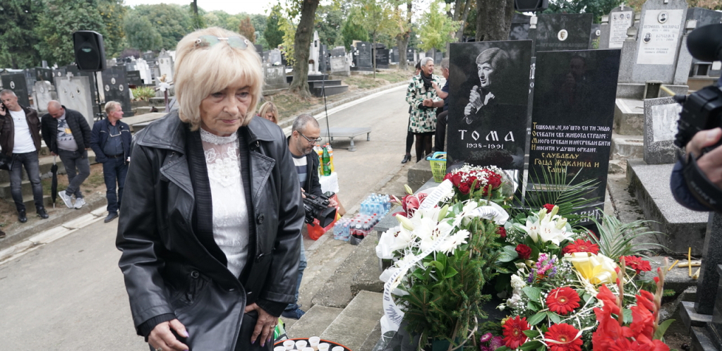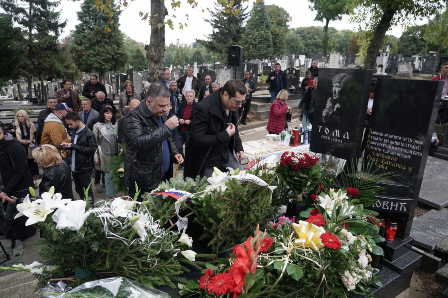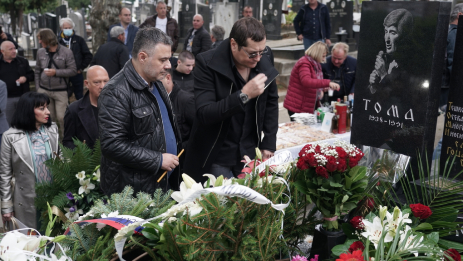 Tomin grob prekriven je velikim buketima ruža, a osim njegove supruge Gordane i članova porodice, pomenu prisustvuju Tomini brojni prijatelji i kolege sa estrade, među kojima su Aco Pejović, Hasan Dudič, Milan Marić, Marko Bulat i drugi.