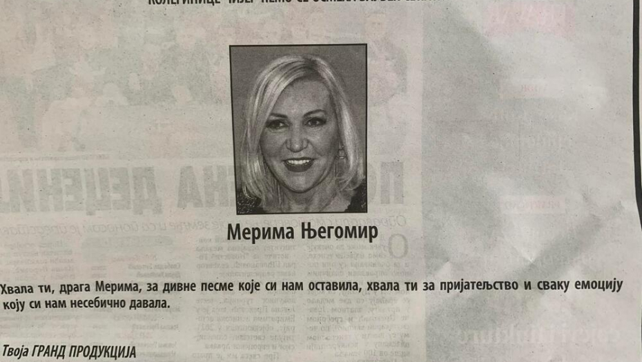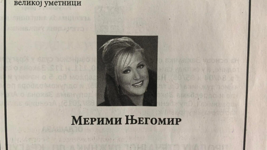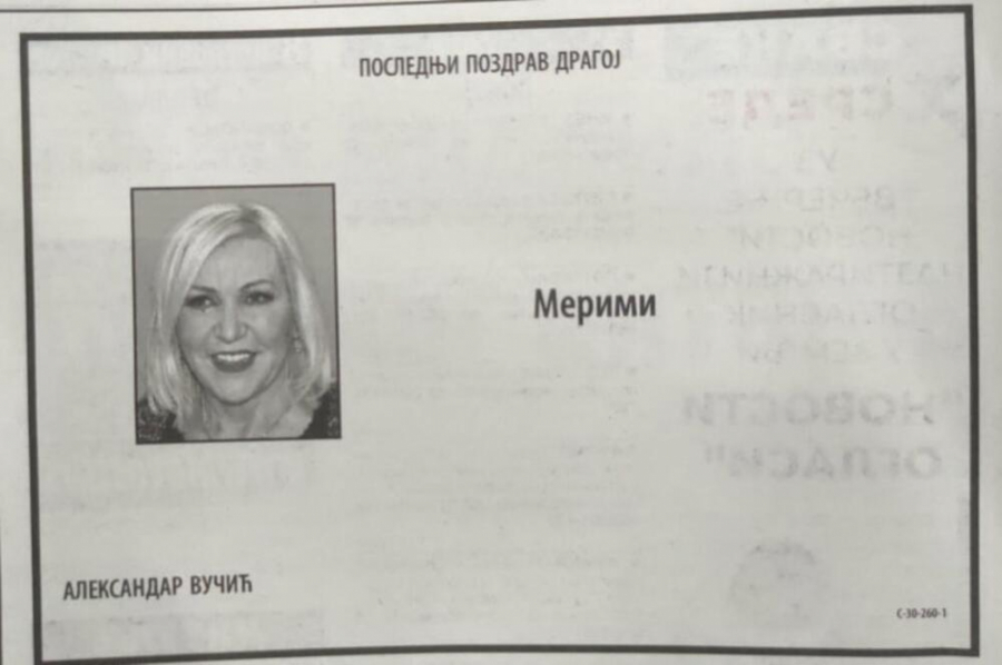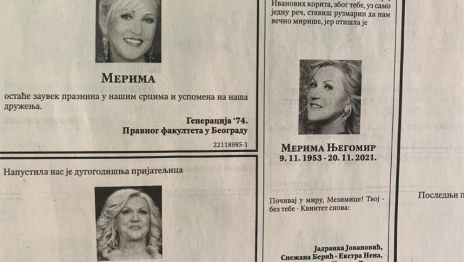 Naime, na skoro čitavoj jednoj strani osvanule su čitulje za Merimu, a među njima su se oprostili predsednik Srbije Aleksandar Vučić, pevačica Ekstra Nena, PGP RTS, Pravni fakultet, Grand produkcija i mnogi drugi.