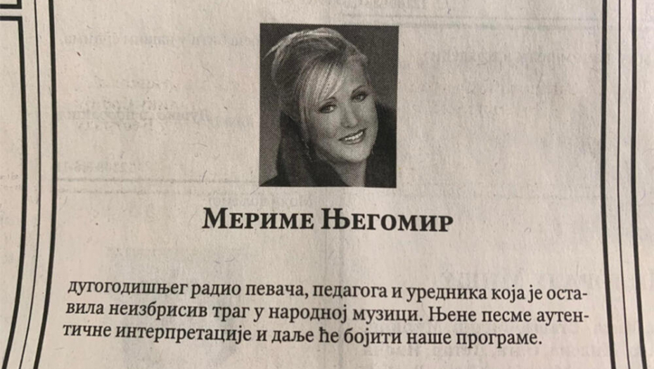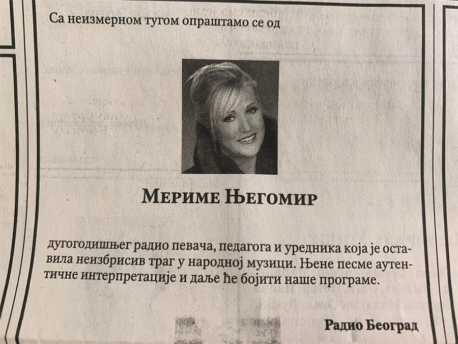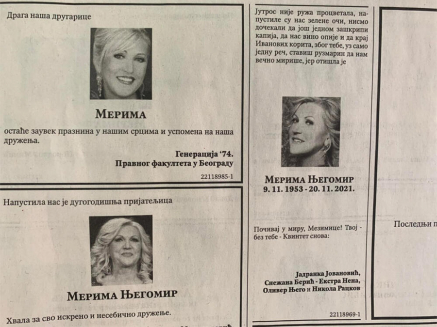 JAVNOST SE OPRAŠTA OD ČUVENE PEVAČICE! Čitulje prepune potresnih reči za Merimu Njegomir, prijatelji slomljeni uputili poslednji pozdrav! (FOTO)