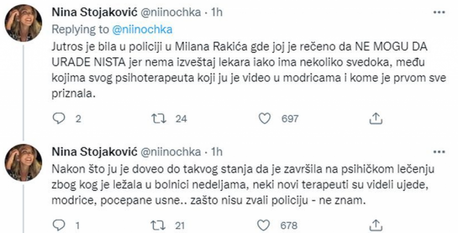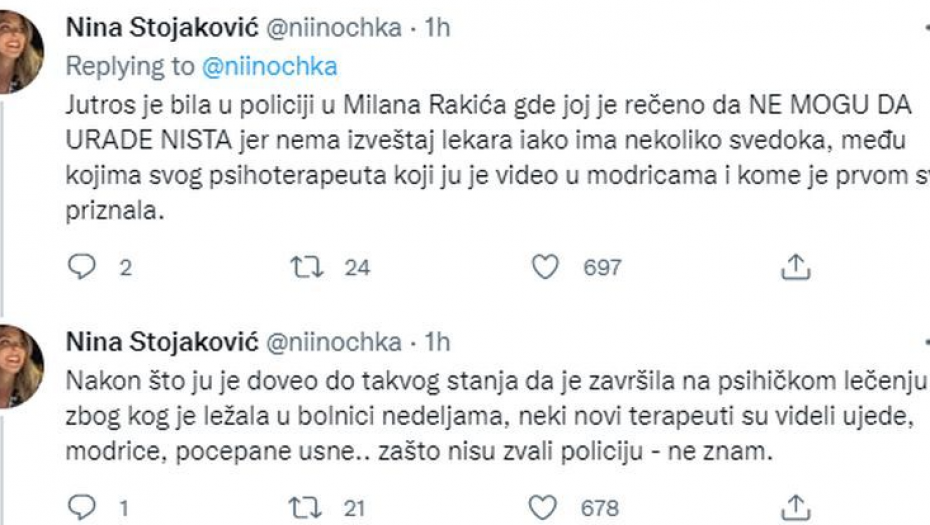 - Dečko koji je nije samo tukao, već gušio do onesvešćivanja, psihički zlostavljao i manipulisao njenom bolešću zove se Uroš Radivojević, mlađima poznat kao Numero, reper. Ako policija ne može da uradi ništa, ja mogu da stanem uz svoju sestru i kažem javno ime i prezime nasilnika - tvrdi Nina.