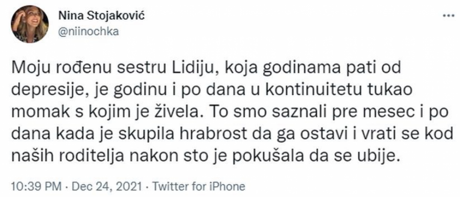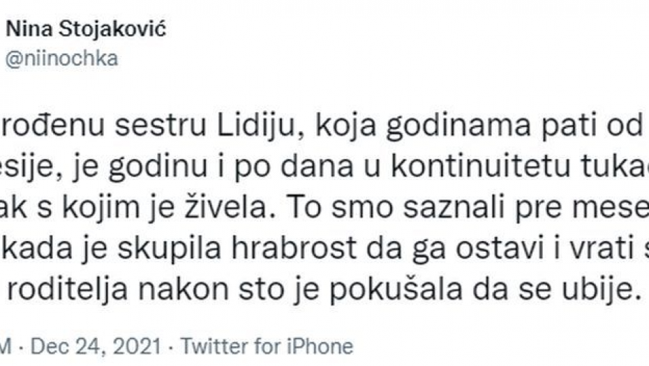 Nina Stojaković, verenica predsednika Pokreta slobodnih građana Pavla Grbovića i politička aktivistkinja, na svom Tviter nalogu podelila je šta se navodno dogodilo njenoj rođenoj sestri Lidiji, tvrdeći da je navodno trpela užasno nasilje od strane doskorašnjeg dečka Uroša Radivojevića, poznatijeg kao reper Numero, sa kojim je raskinula pre mesec i po dana.