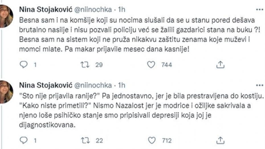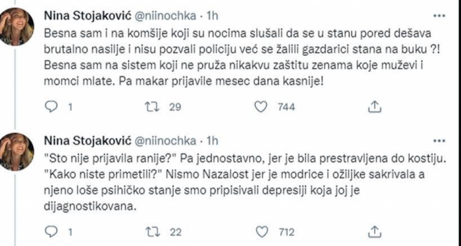 - Nakon što ju je doveo do takvog stanja da je završila na psihičkom lečenju zbog kog je ležala u bolnici nedeljama, neki novi terapeuti su videli ujede, modrice, pocepane usne.. zašto nisu zvali policiju - ne znam. Besna sam i na komšije koji su nocima slušali da se u stanu pored dešava brutalno nasilje i nisu pozvali policiju već se žalili gazdarici stana na buku ?! Besna sam na sistem koji ne pruža nikakvu zaštitu zenama koje muževi i momci mlate. Pa makar prijavile mesec dana kasnije - dodala je Nina.