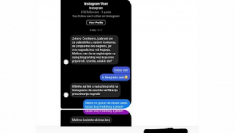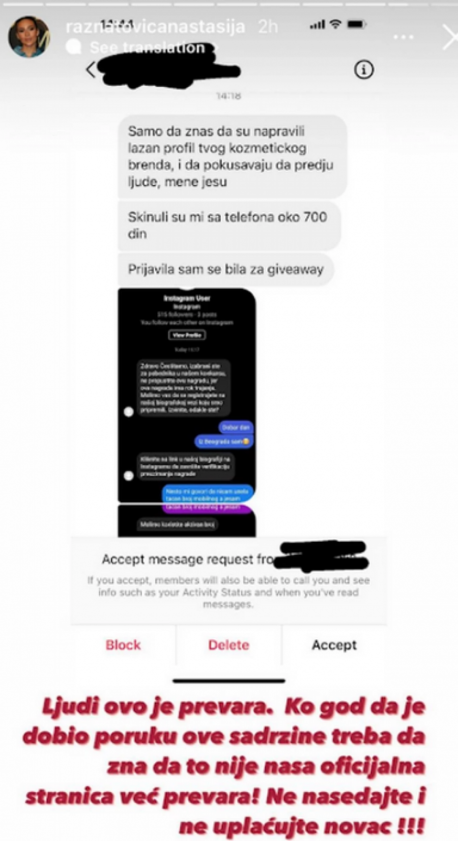 Naime, pevačica je objavila da se radi o tome da ljudima na Instagramu stižu poruke da kliknu na određeni link, kako bi preuzeli nagradu usled giveaway-a, a onda im se skida novac.