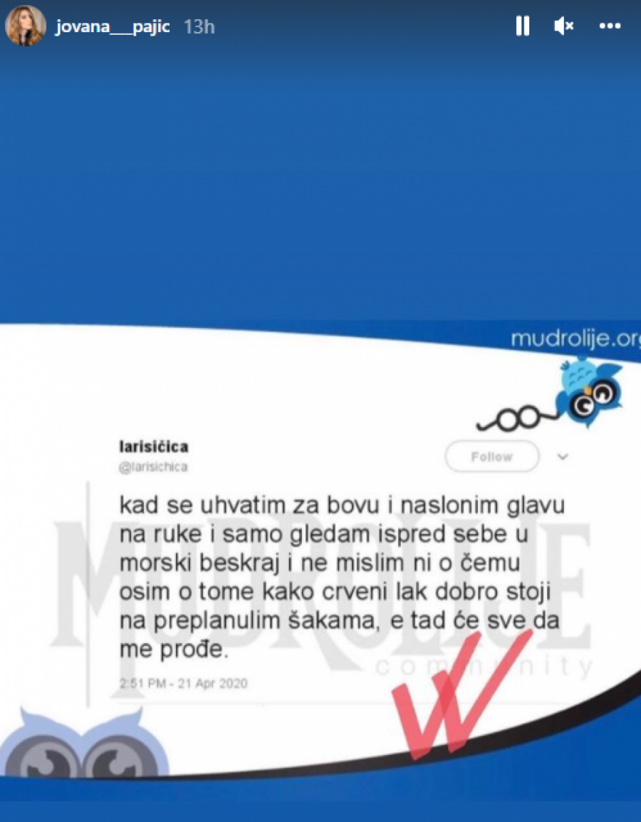 - Kad se uhvatim za bovu i naslonim glavu na ruke i samo gledam ispred sebe u morski beskraj i ne mislim ni o čemu osim o tome kako crveni lak dobro stoji na preplanulim šakama, e tad će sve da me prođe - objavila je Jovana Pajić.