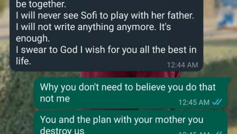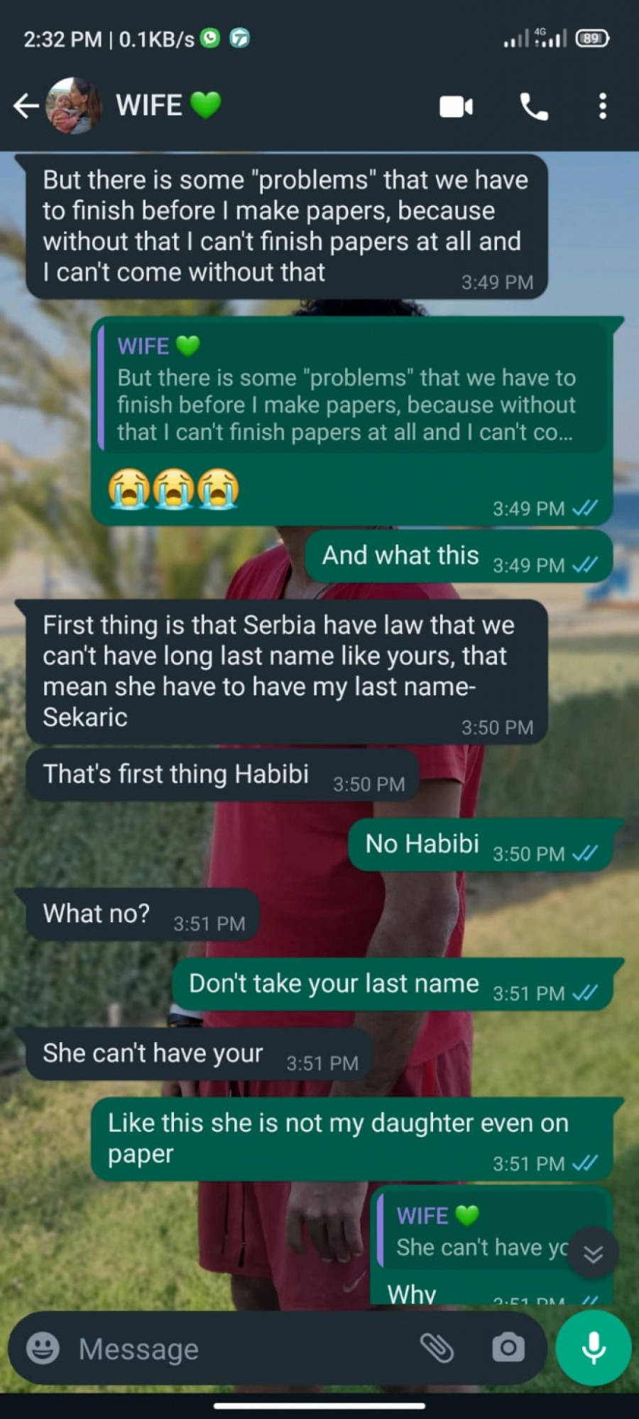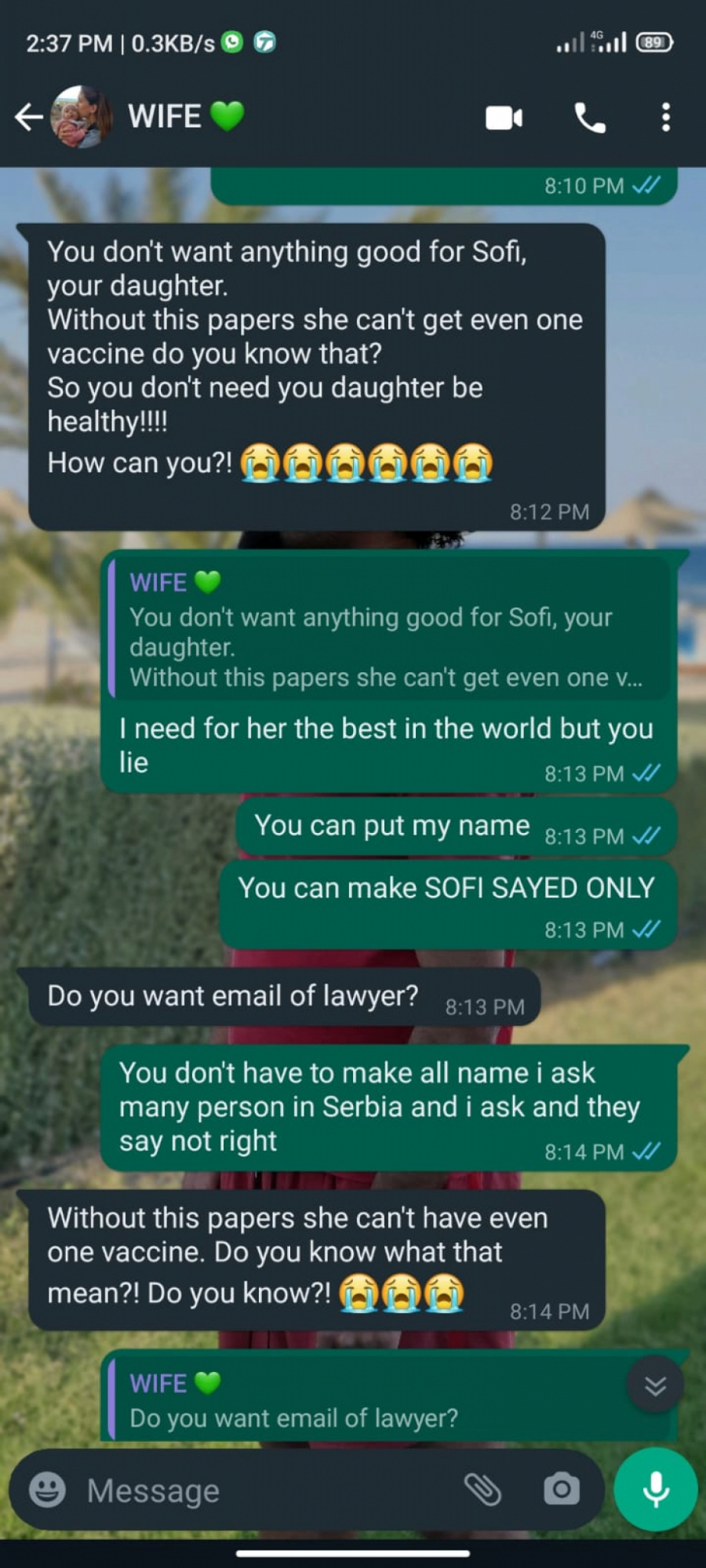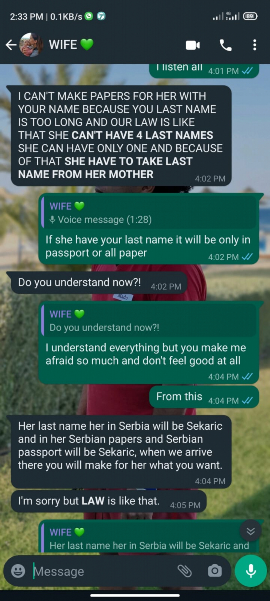 U prepisci koju nam je Sajed prosledio prikazane su poruke u kojima mu Lea, navodno, poručuje da mora da joj da starateljstvo nad ćerkom jer prema srpskim zakonima Sofi ne može da ima oca sa četiri prezimena.