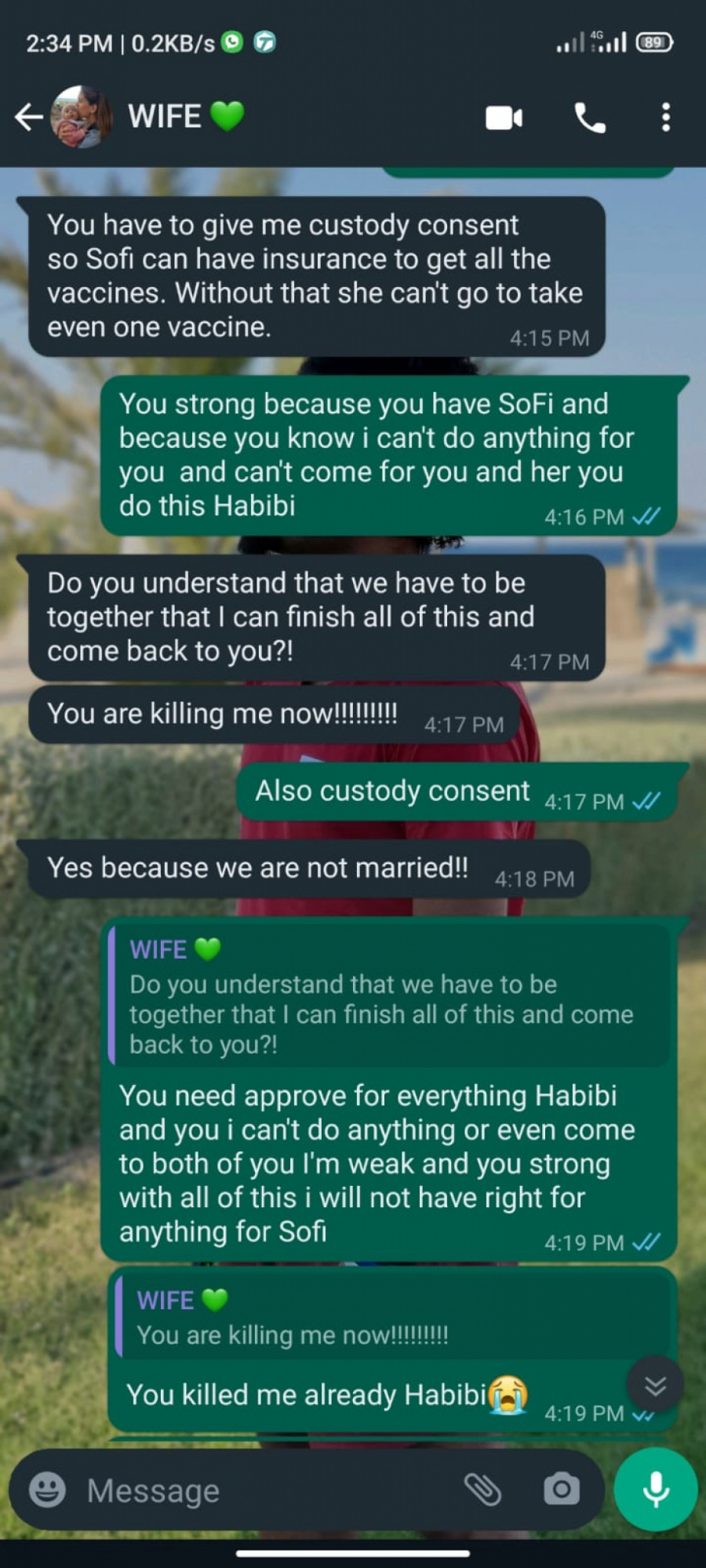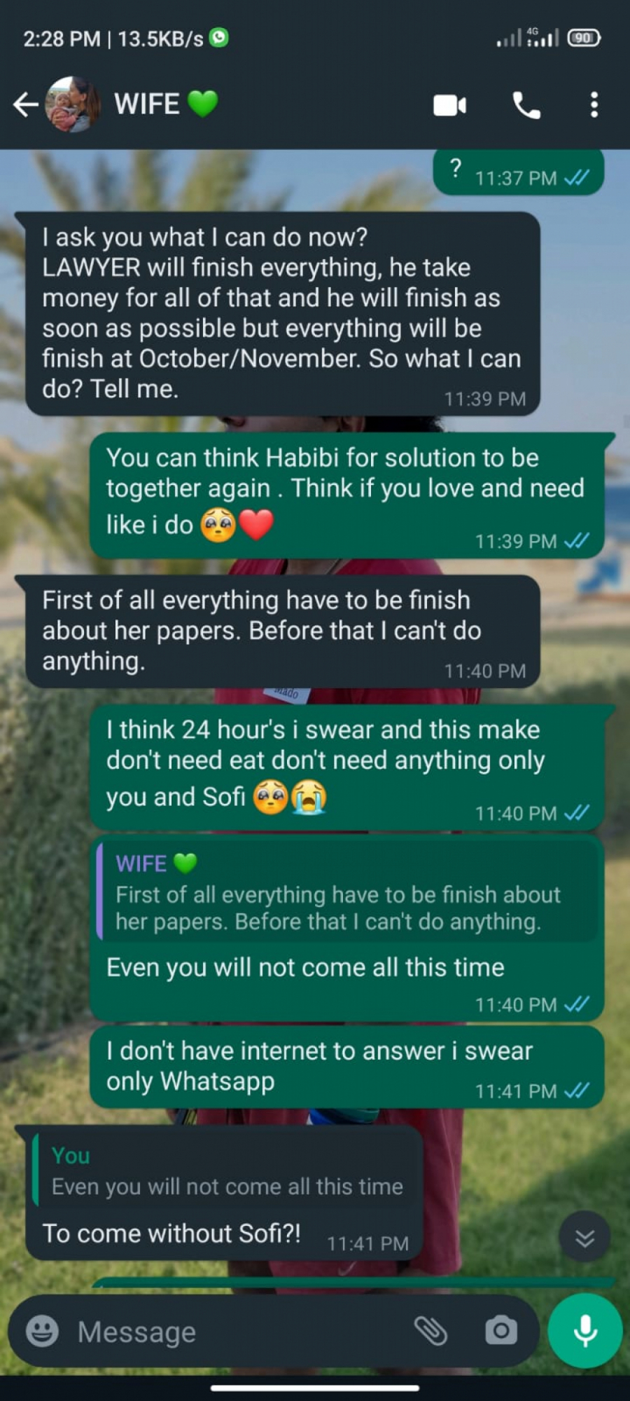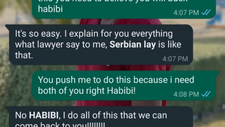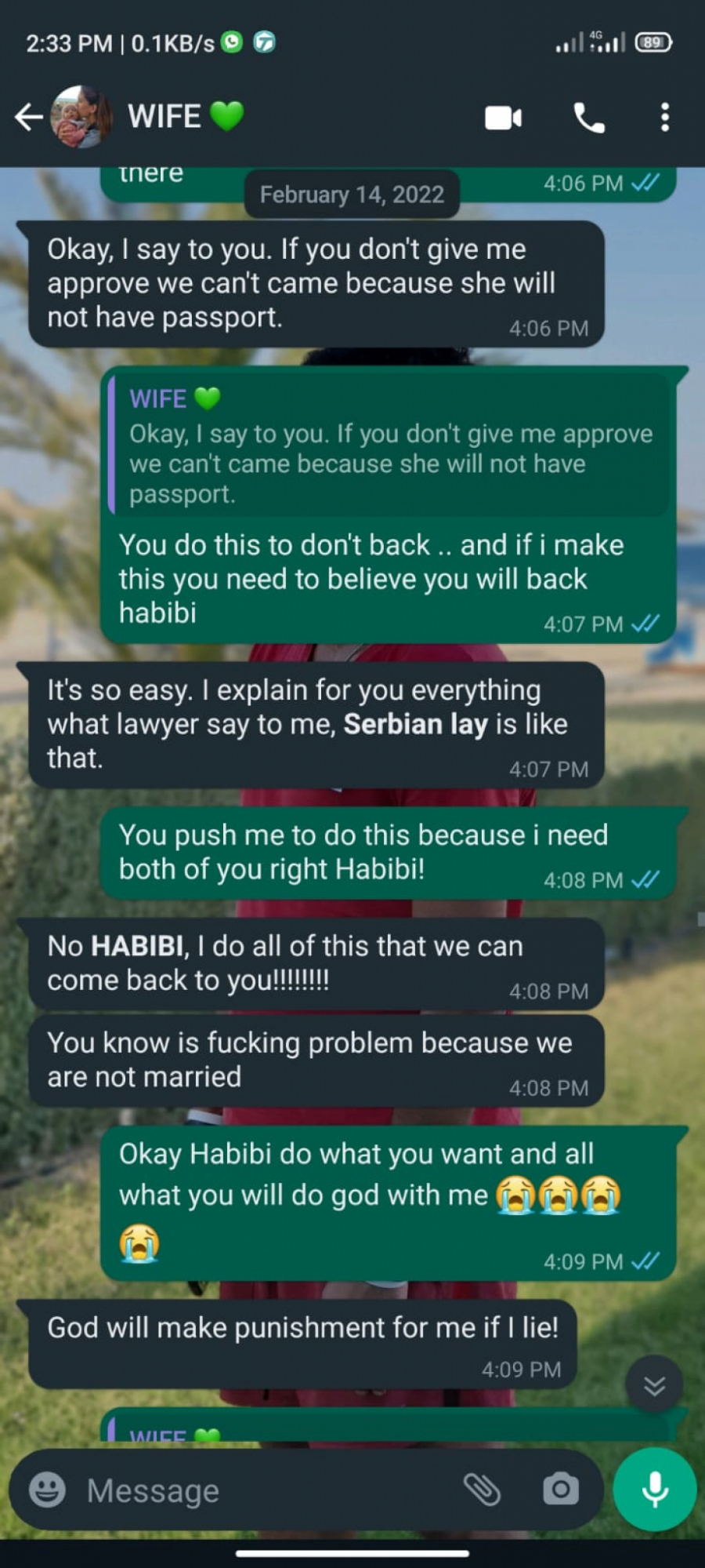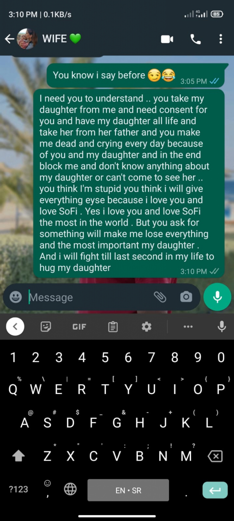 U prepisci koju nam je Sajed prosledio prikazane su poruke u kojima mu Lea, navodno, poručuje da mora da joj da starateljstvo nad ćerkom jer prema srpskim zakonima Sofi ne može da ima oca sa četiri prezimena.