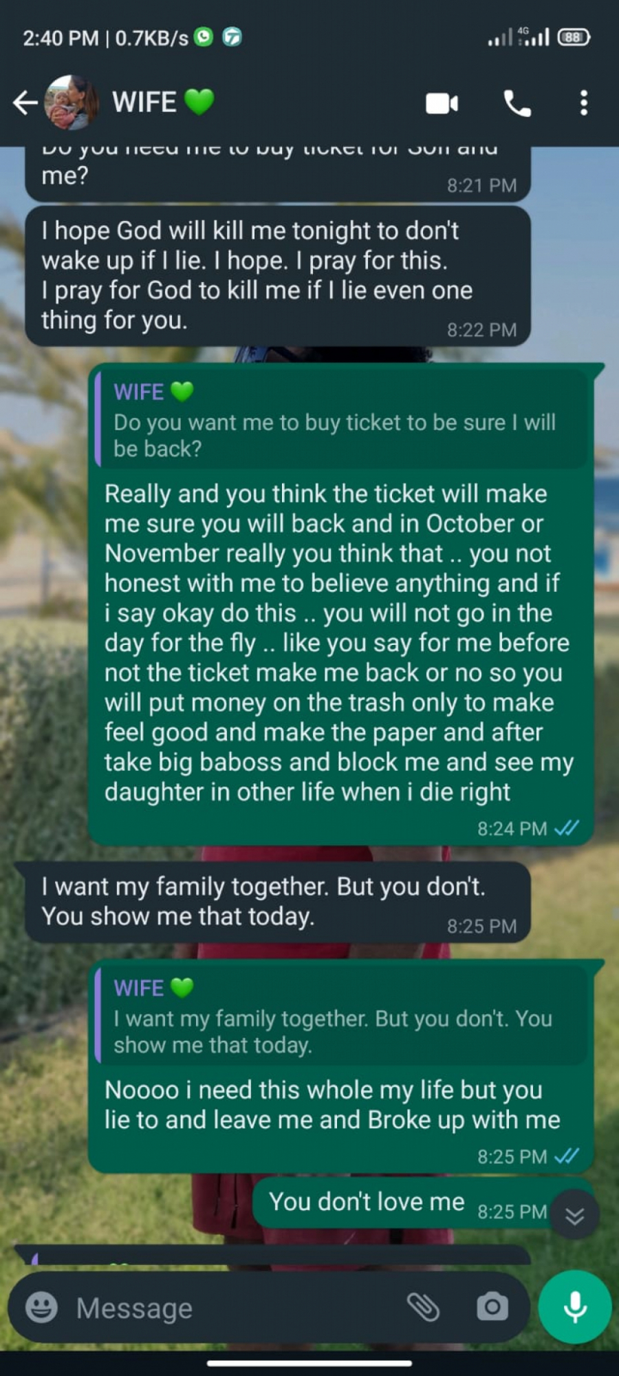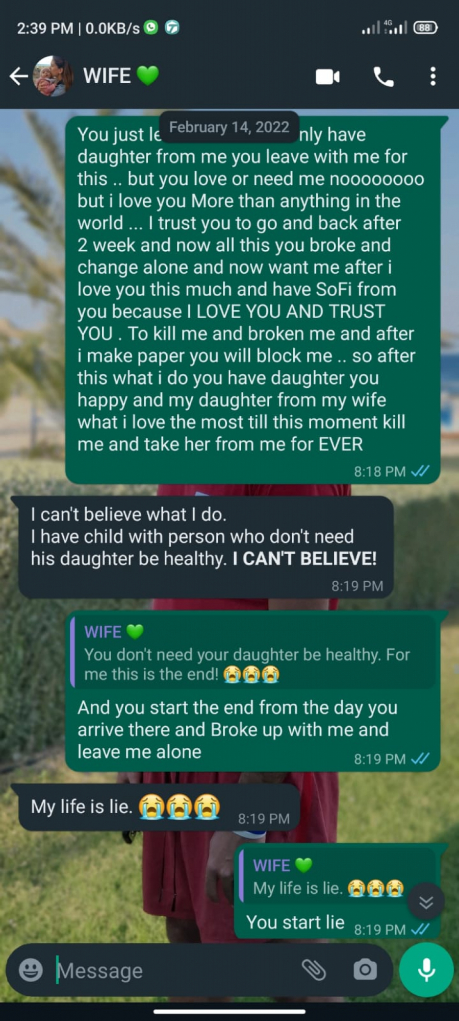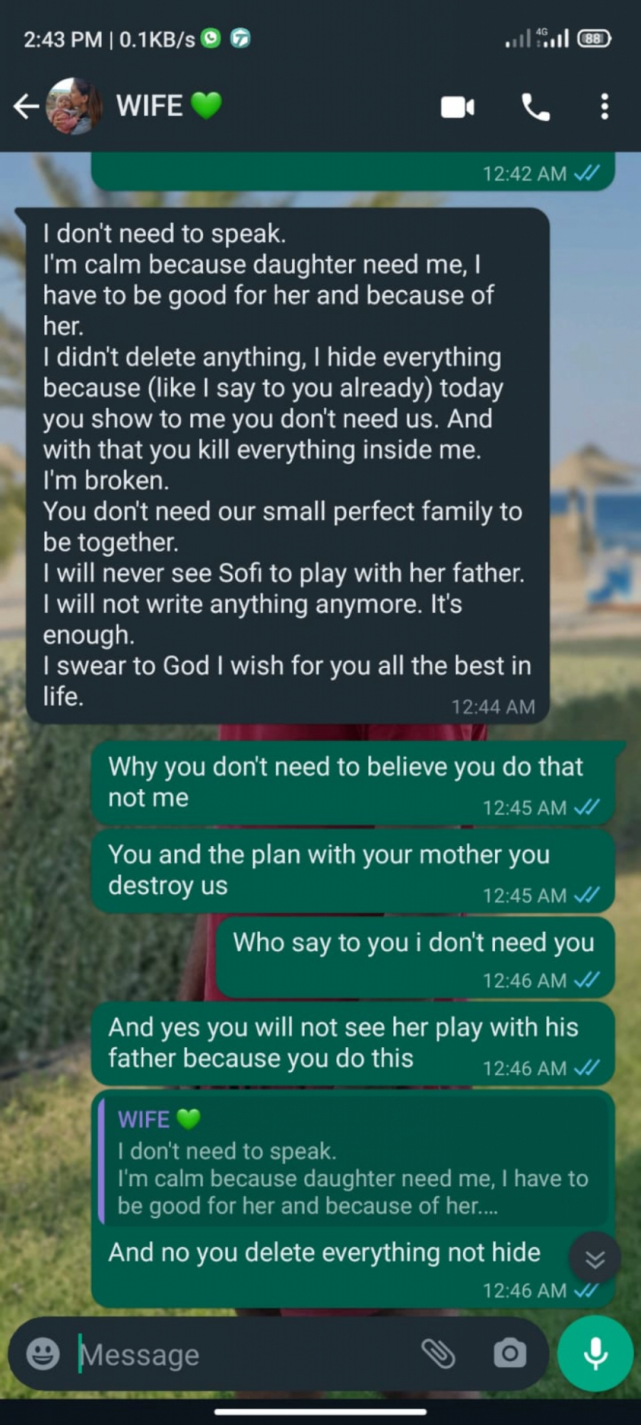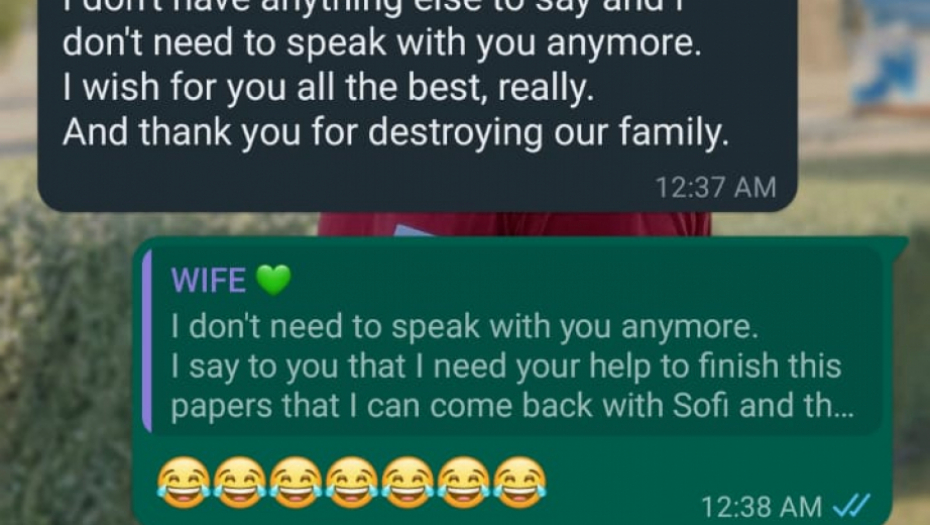 U prepisci koju nam je Sajed prosledio prikazane su poruke u kojima mu Lea, navodno, poručuje da mora da joj da starateljstvo nad ćerkom jer prema srpskim zakonima Sofi ne može da ima oca sa četiri prezimena.