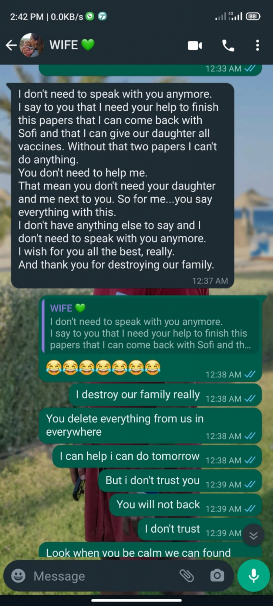 Prema njegovim rečima, tada je Lea navodno zatražila od njega da se odrekne starateljstva nad ćerkom, pod izgovorom da jedino tako može da dobije medicinsku negu u Srbiji.