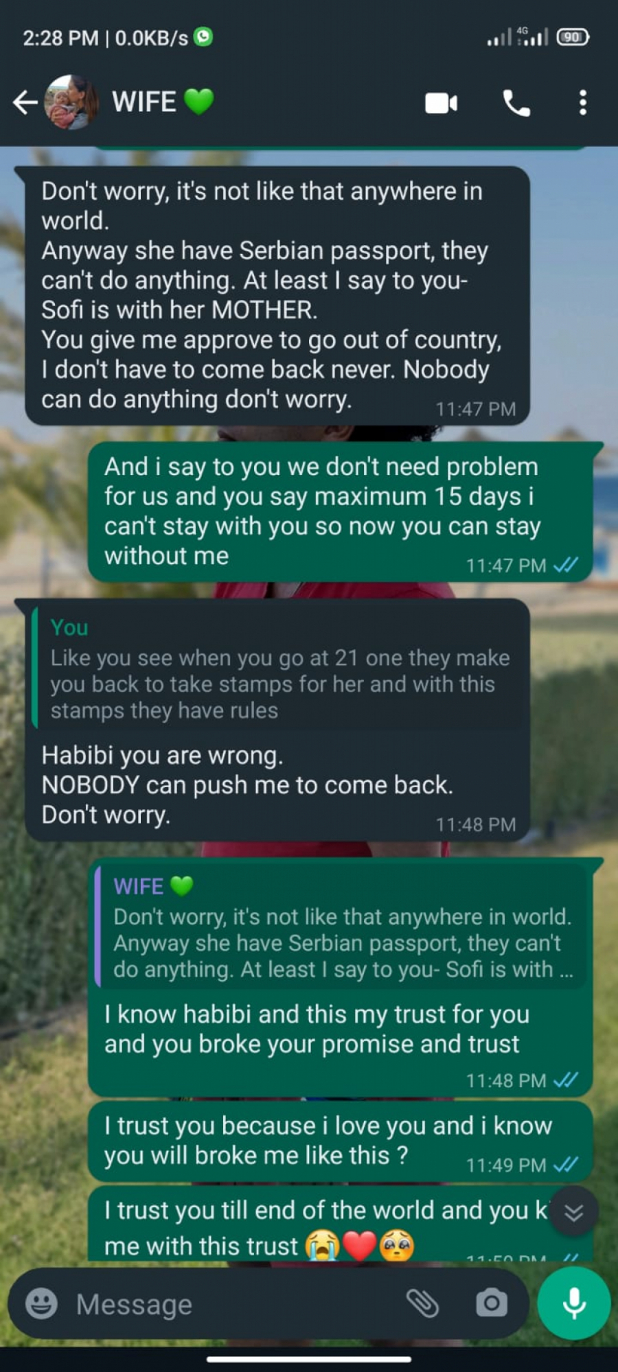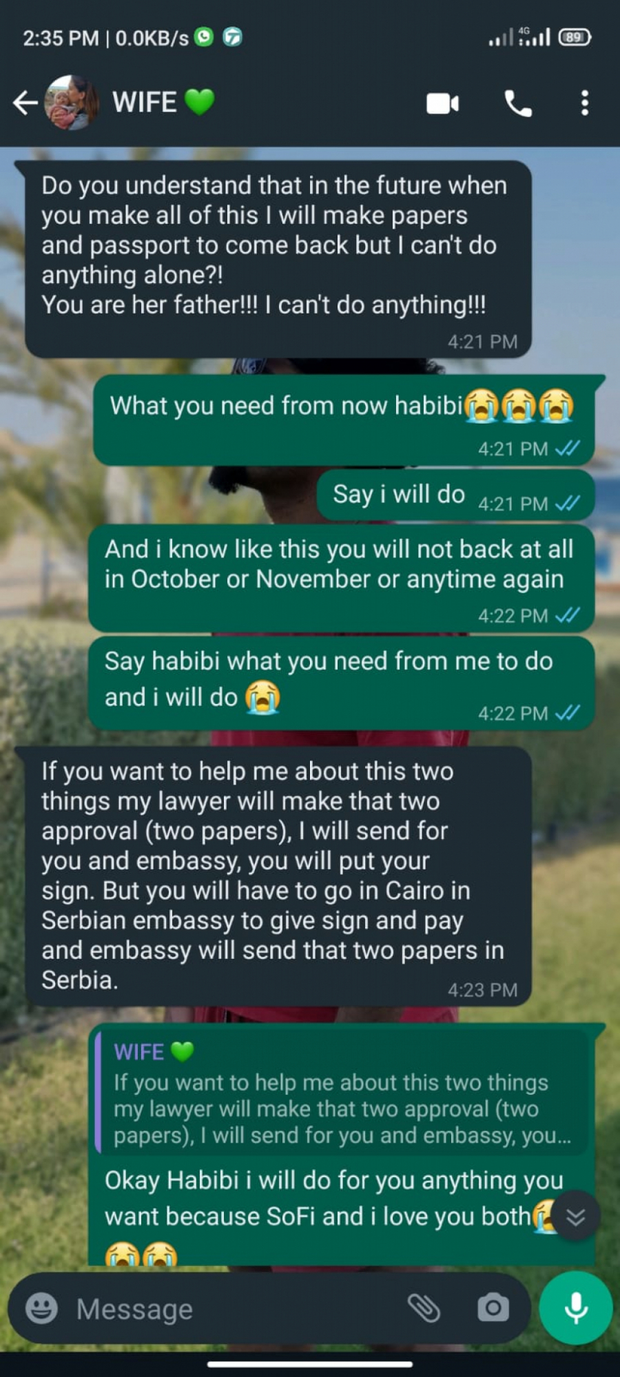 - Lea mi je rekla da joj je baka bolesna, da žena ima 80 godina i da su male šanse da će preživeti, te da ne želi da umre dok ne vidi praunuku Sofi. Plakala je i objasnila mi da joj je deda umro pre nego što je upoznao našu ćerku i da ne želi da se isto desi njenoj babi. Ja sam razumeo situaciju, i podržao sam je u odluci da s našom ćerkom dođe u Srbiju kako bi bila uz bolesnu baku. Rekla je da će se zadržati smo dve nedelje jer ne može da izdrži duže bez mene i ja sam potpisao dozvolu da izvede dete iz države na 15 dana. Međutim, tri dana nakon što je sletela u Beograd sve se promenilo - prepričavao nam je čitavu situaciju di-džej iz Egipta.