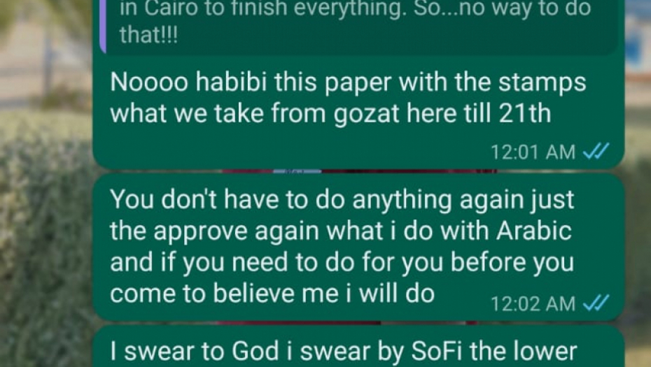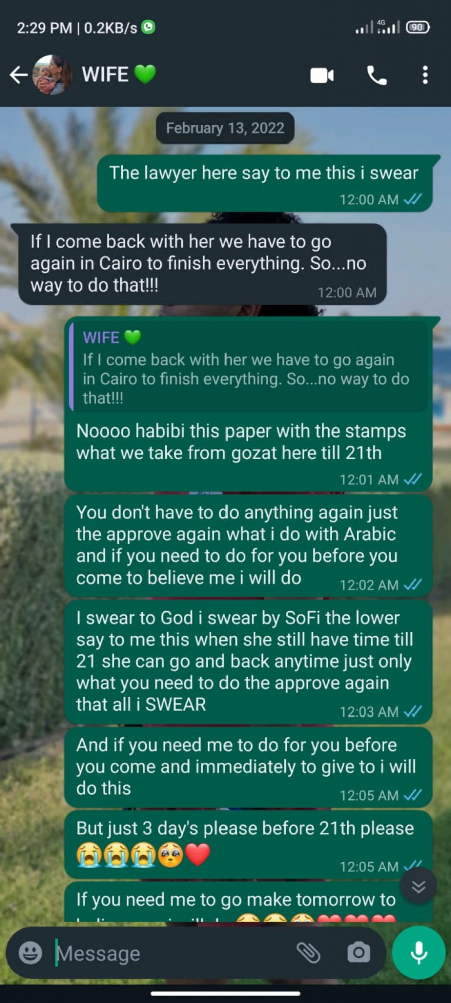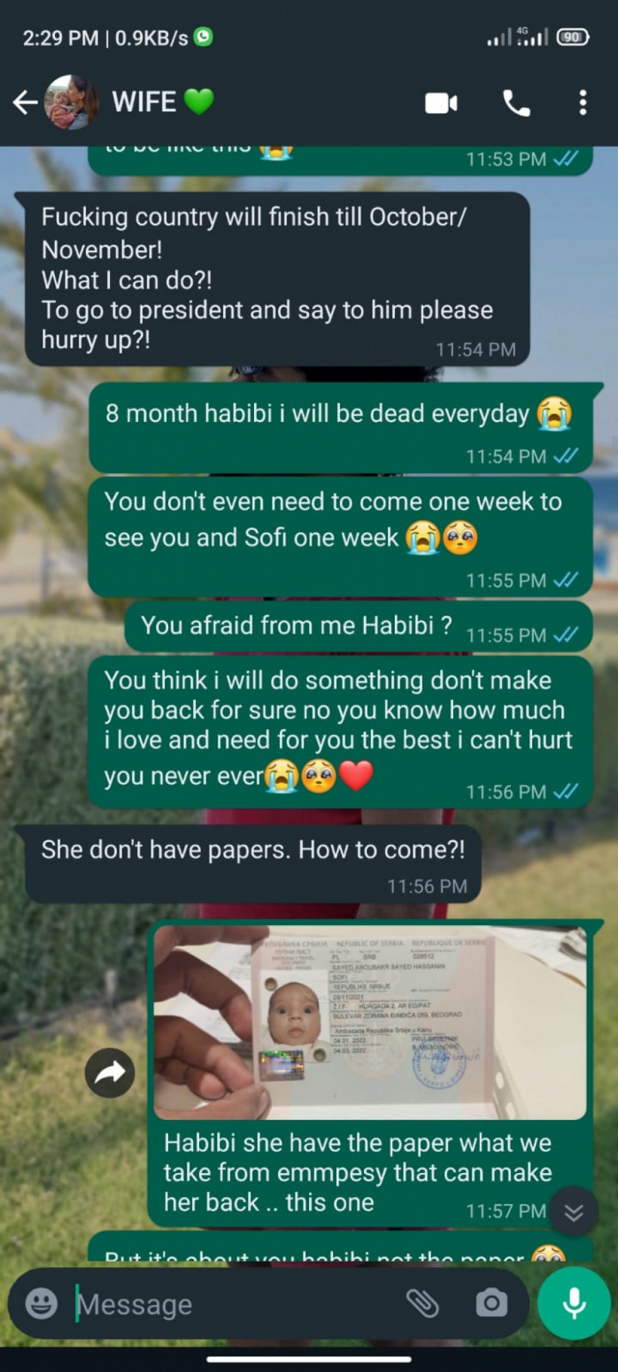 U prilog tih tvrdnji Sajed je našoj redakciji poslao i prepisku sa Leom, a u kojoj mu ona navodno piše da nema nameru da se vrati u Egipat i traži mu da se odrekne starateljstva nad detetom.